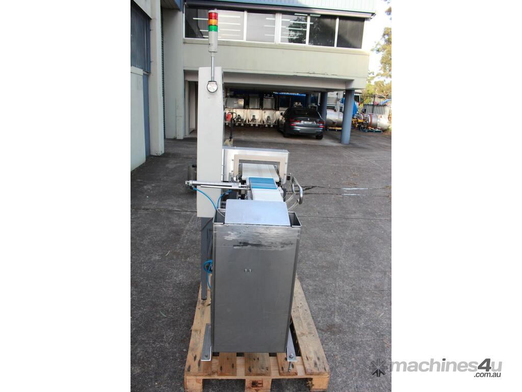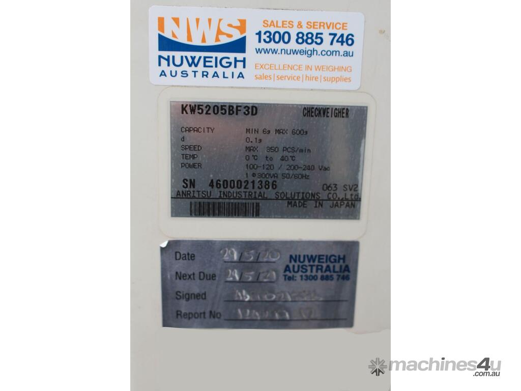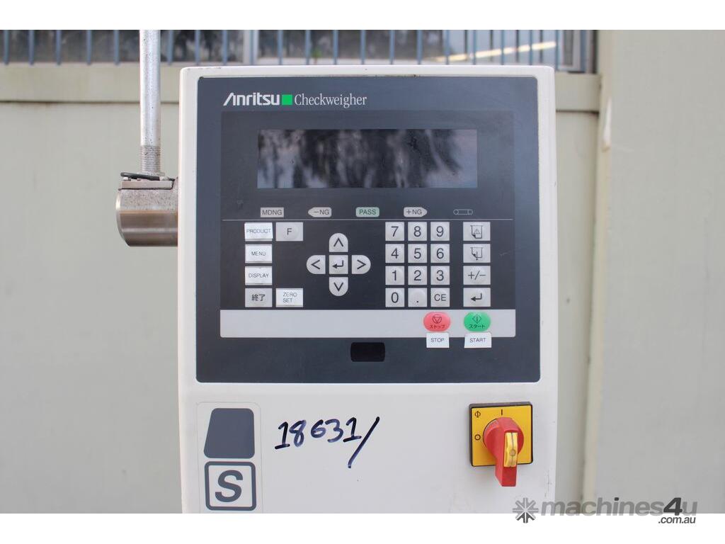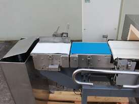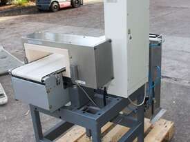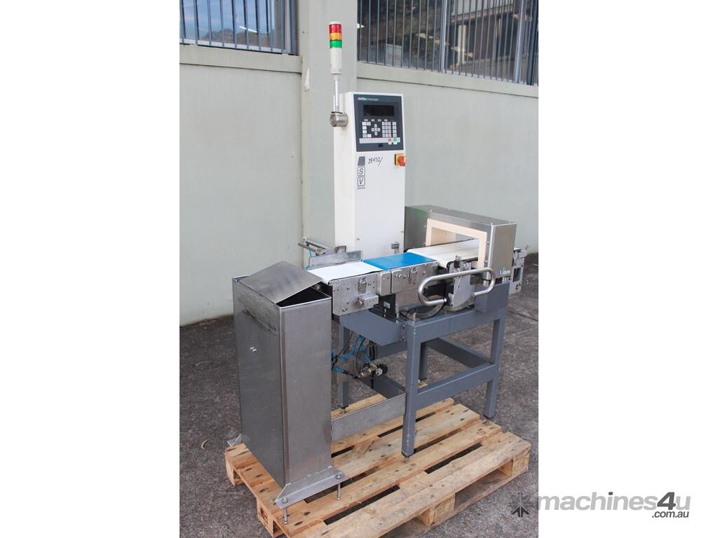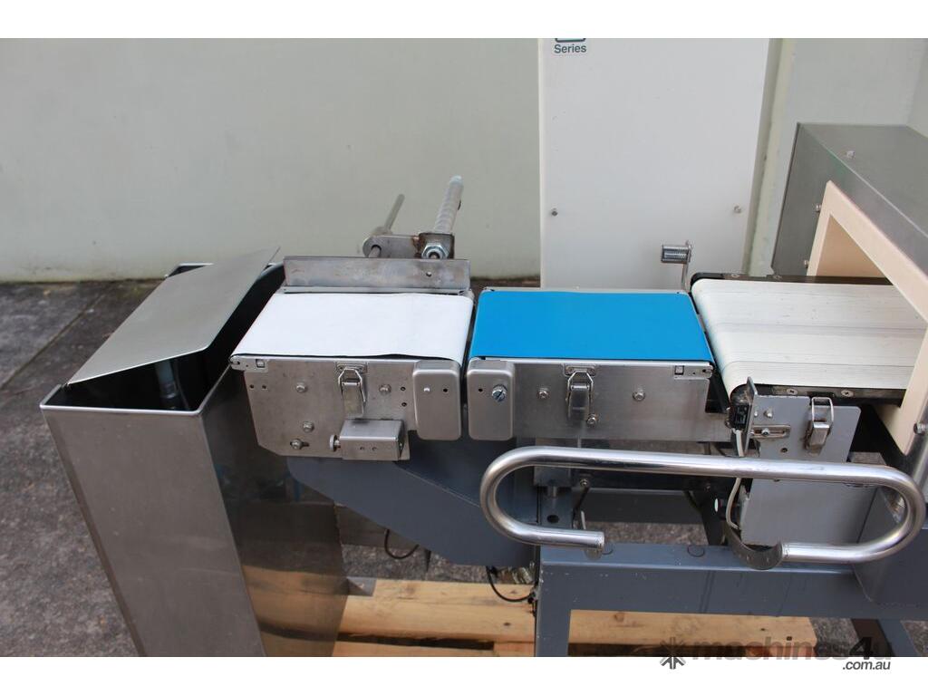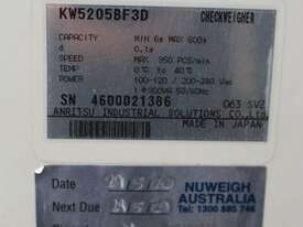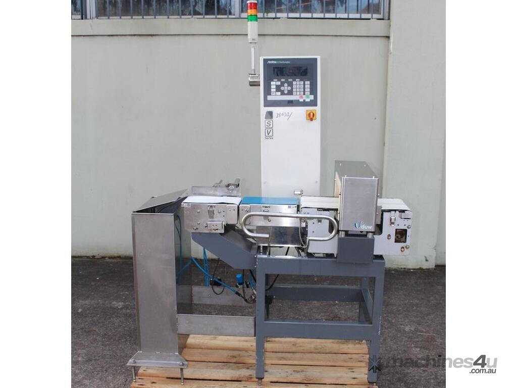 Metal Detector with Check Weigher, "Anritsu" SVF Series model KW5205BF3D, weigh range: 6 to 600g, product size: 20 to 160mm wide x 58 to 230mm long x 5 to 80 mm high, includes with rejector, stainless steel conveyors, mounted on painted frame, single phase