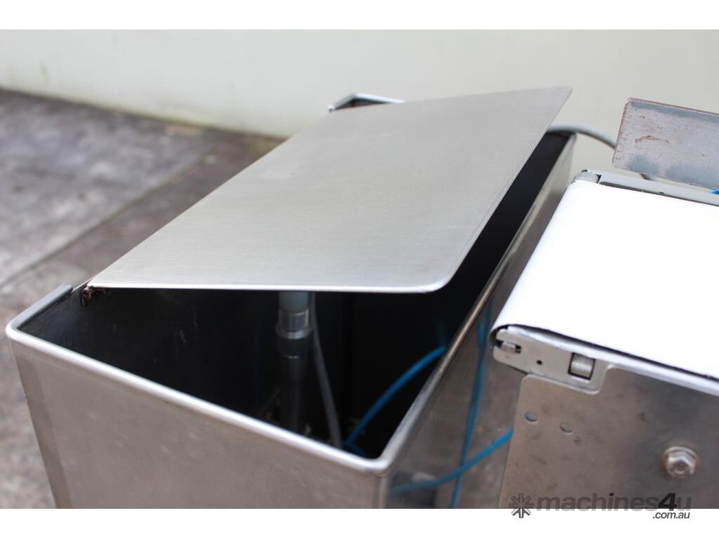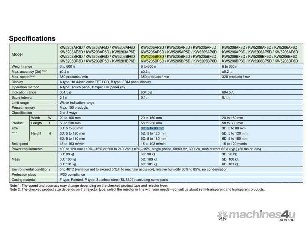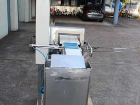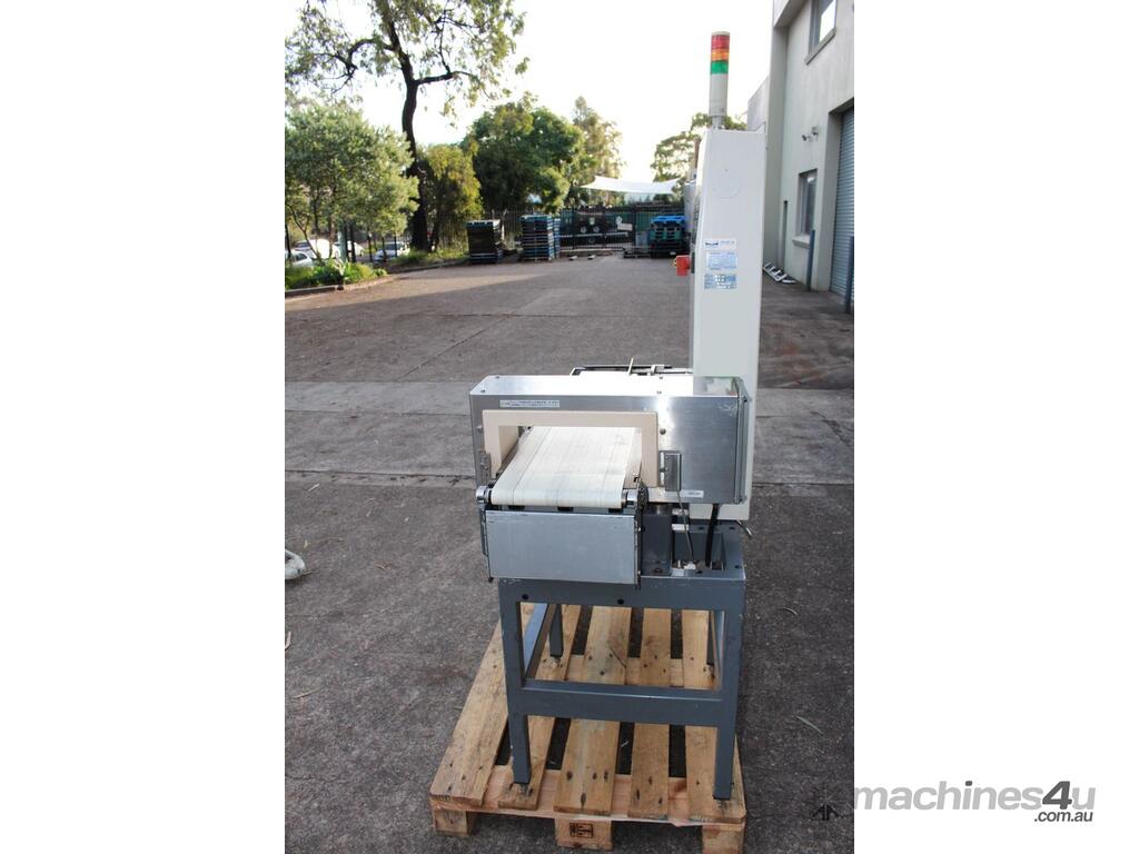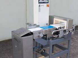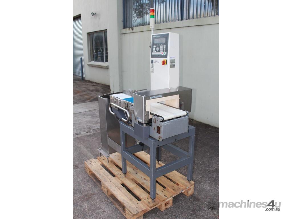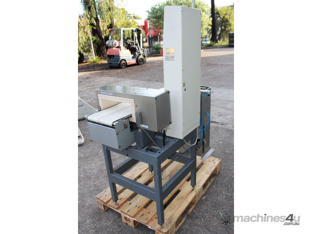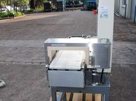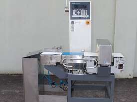 Metal Detector with Check Weigher, "Anritsu" SVF Series model KW5205BF3D, weigh range: 6 to 600g, product size: 20 to 160mm wide x 58 to 230mm long x 5 to 80 mm high, includes with rejector, stainless steel conveyors, mounted on painted frame, single phase