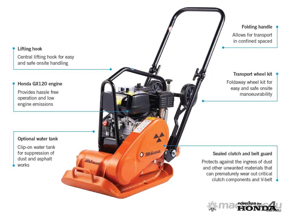 The Mikasa Forward Plate Compactor MVC-F60H is ideal for use in confined spaces and for compacting thin layers such as granular soils including gravel, road base and asphalt.