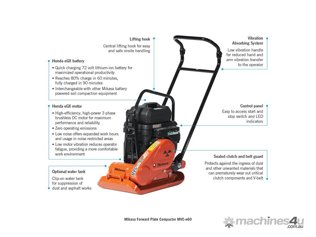 Mikasa Forward Plate Compactors set the standard for the compaction of sub-bases and asphalt. Mikasa Forward Plate Compactors offer superior build quality and excellent performance. They are also highly portable, easily manoeuvrable and deliver excellent compaction results. Mikasa’s battery powered compaction equipment range features a Honda eGX-Series electric motor which is powered by an interchangeable lithium-ion battery pack, capable of rapidly charging to 80% capacity in only 60