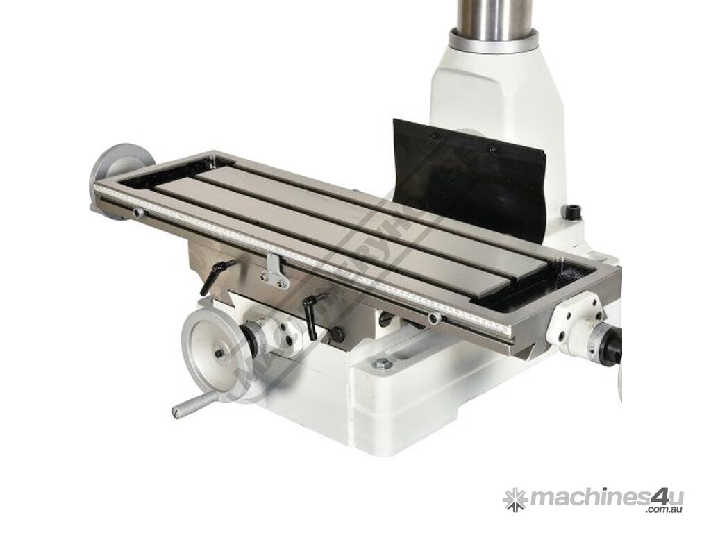 The table has T slots to allow the work to be mounting to table, or in a milling vice, with two large diameter control hand wheels with metric calibrations for the longitudinal axis.