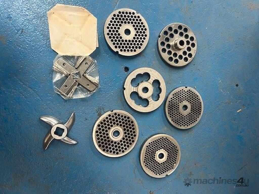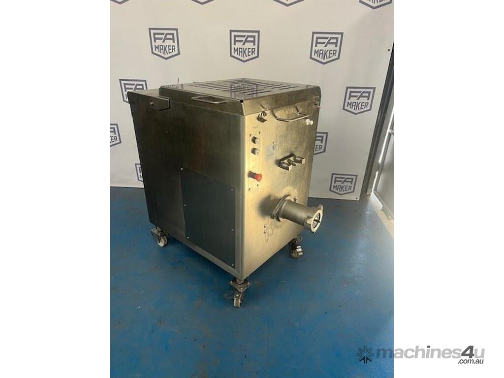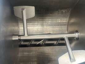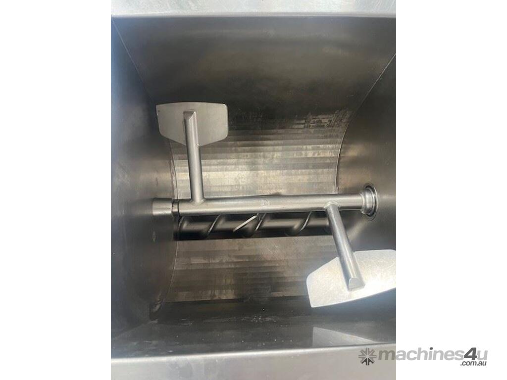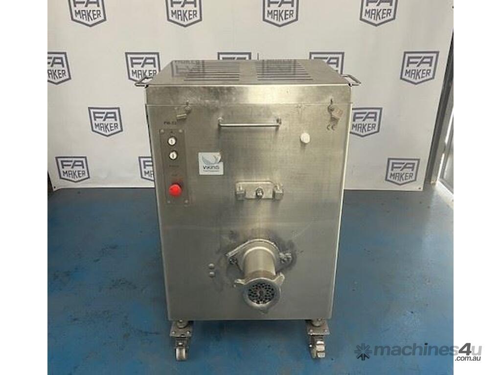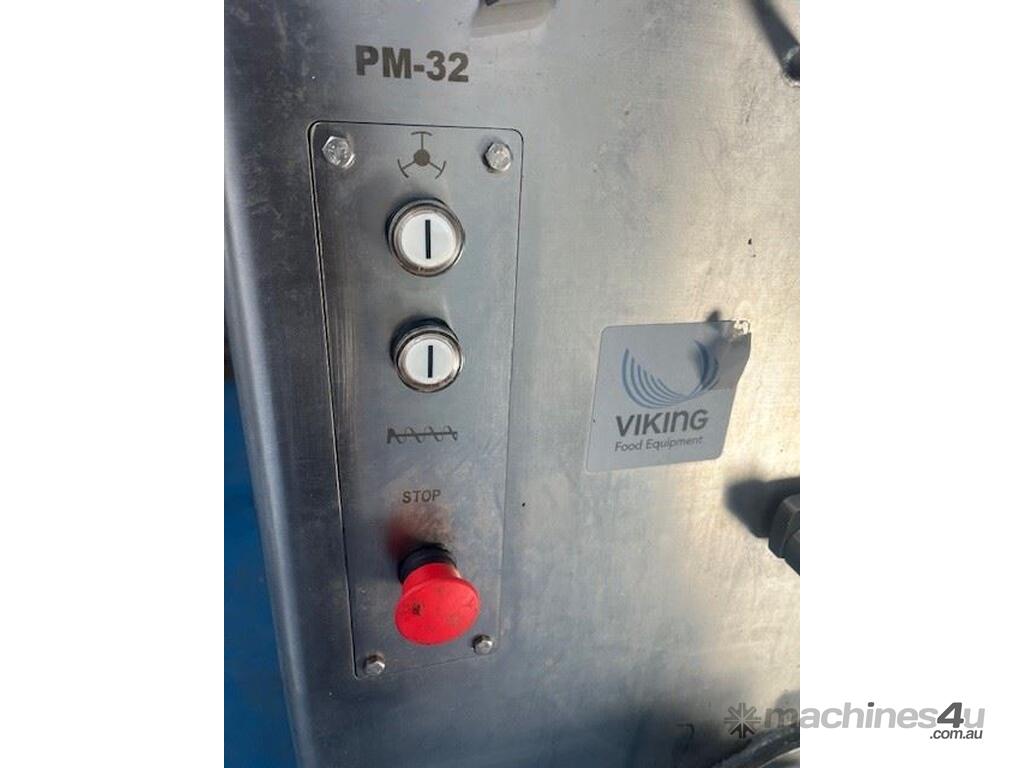 Viking PM32 Mixer Mincer High performance Mixer Mincer, ideal for use in supermarkets and the meat industry, combining excellent mixing and grinding properties. 1500kg/hr with 5 mm die, unit comes with various spare dies. Features: Integrated stainless steel mixer mincer Gear drive transmission Full stainless steel cutting head Automatic feeding with 55kg Bowl Auto reverse mixing paddles Weight: 400kg 415 volt 3 phase on wheels