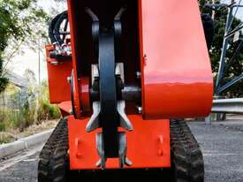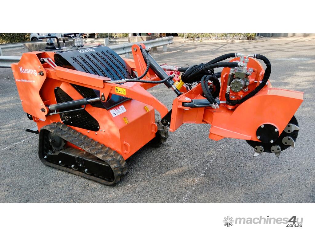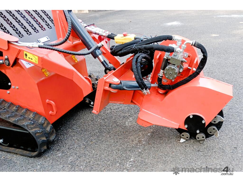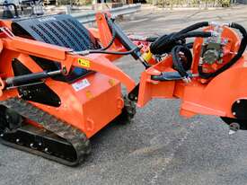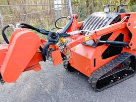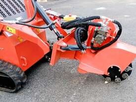 Stump grinder attachments for track loaders are hydraulically powered rotating cutting wheels that are mounted to the track loader quick-attach plate for grinding tree stumps above and below ground level?