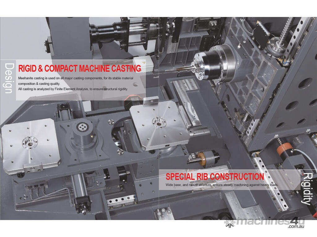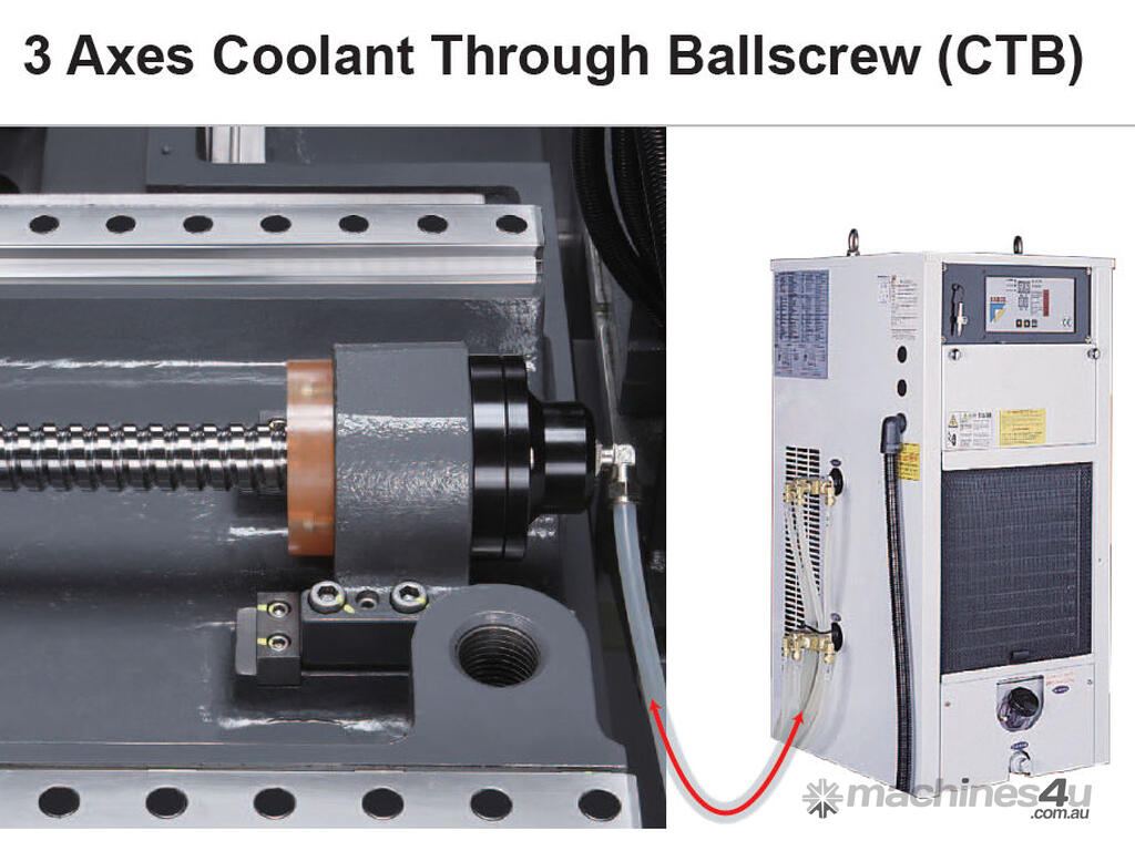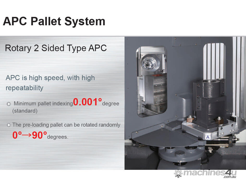 C/w: chain type ATC, 0.001° pallet indexing, direct drive spindle motor, preparation for CTS, oil skimmer, spindle and ballscrew chiller, . Other options are available on request.