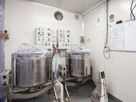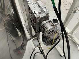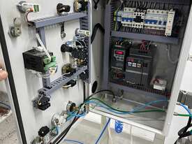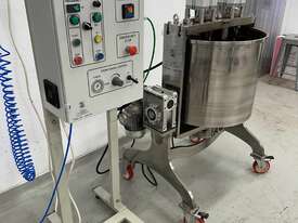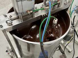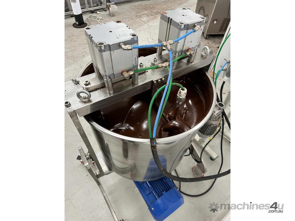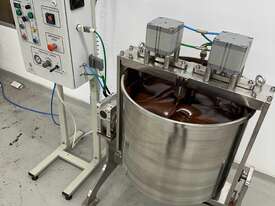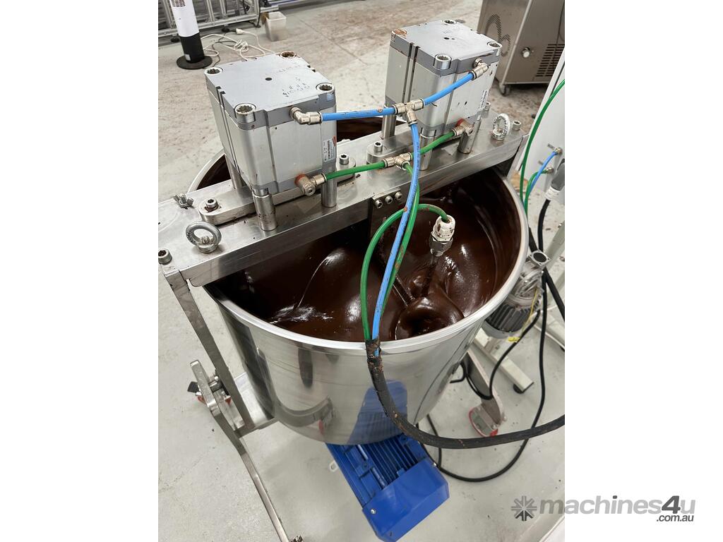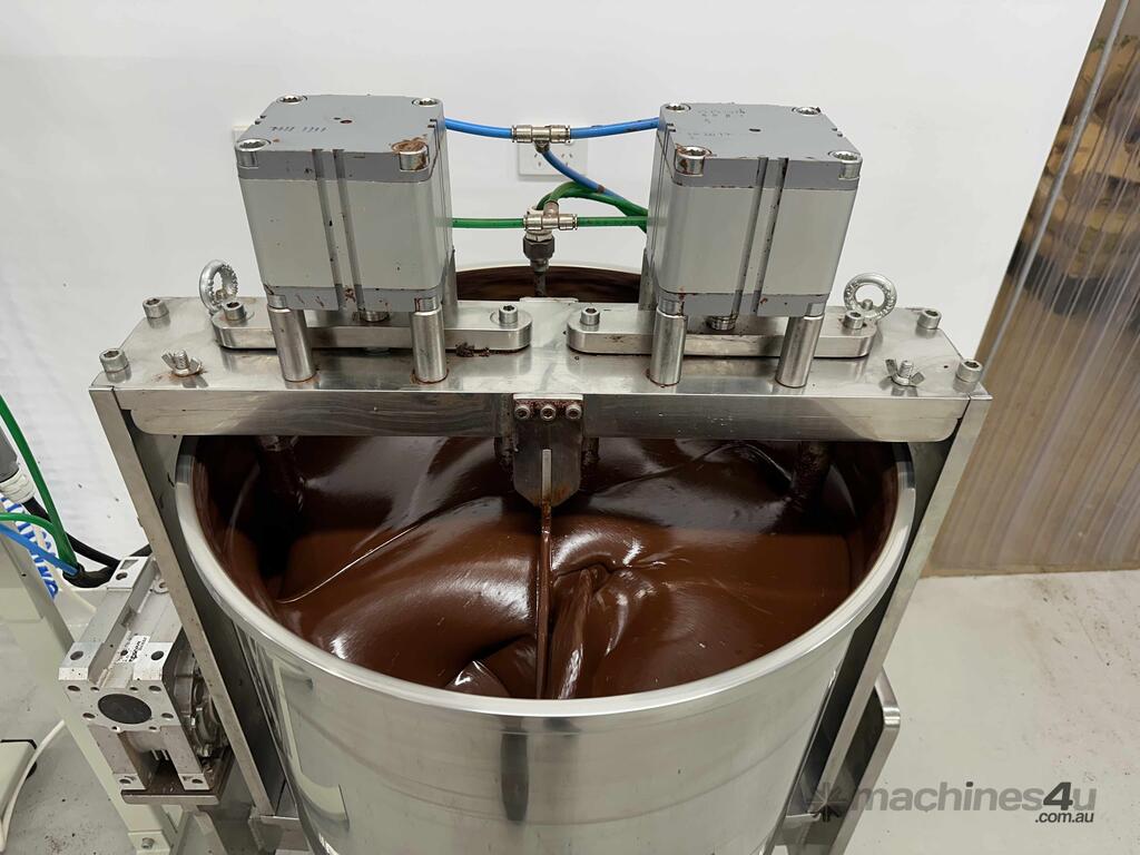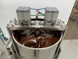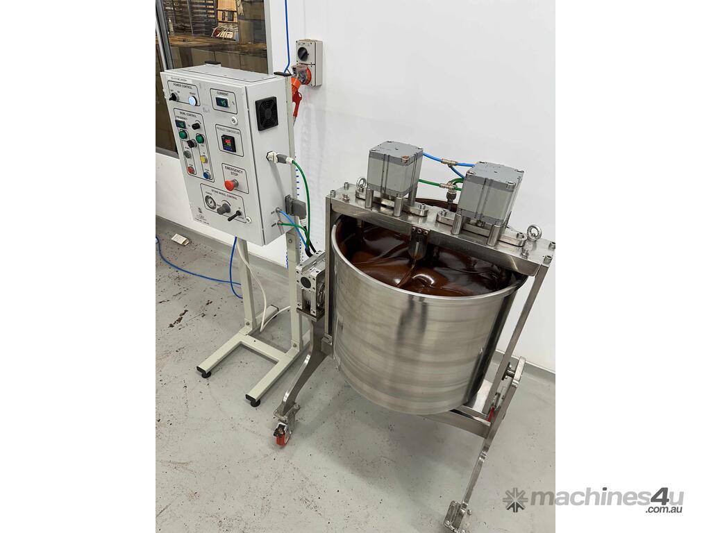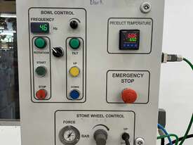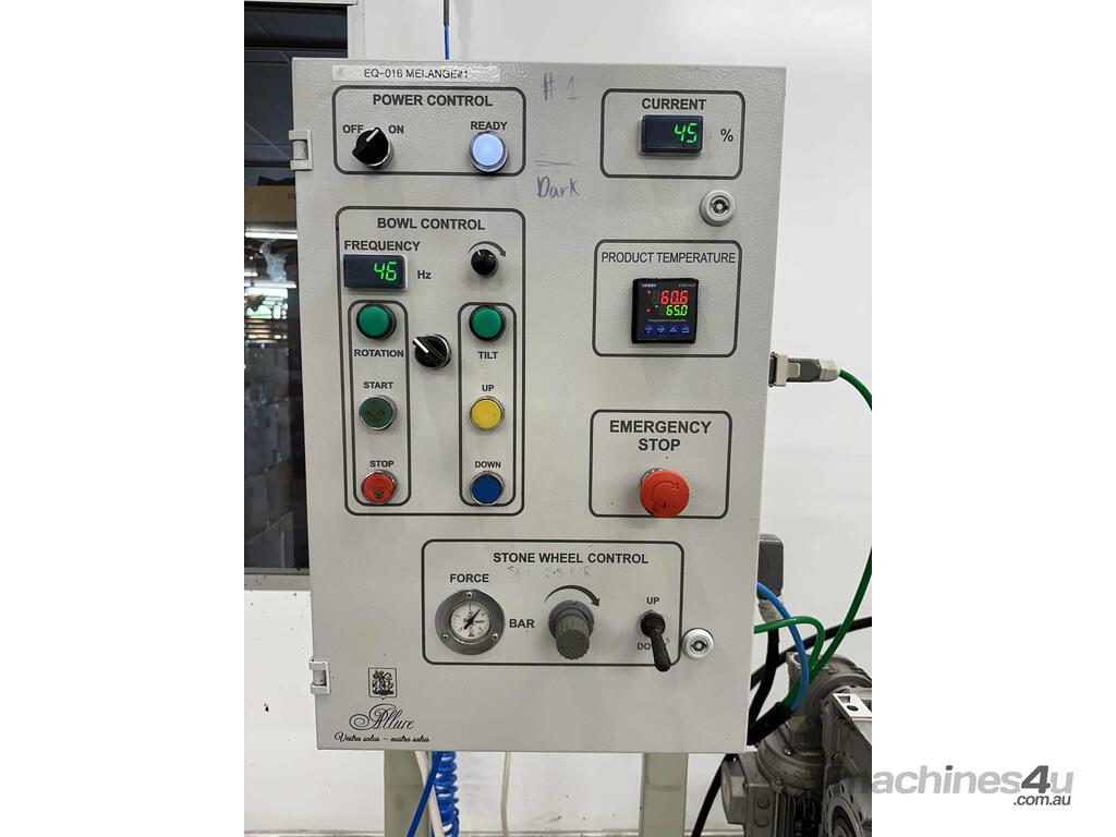 The digital control panel allows adjustment of drum speed and wheel pressure. Control read-outs include speed, pressure, temperature and energy use. The drum has a separate servo motor for tilting the whole drum to pour out the finished chocolate. It also has built-in speed reduction should the chocolate temperature exceed a programmed level.