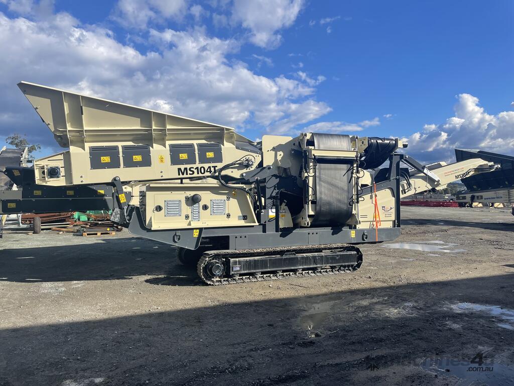 IMS- Ms104T Track scalping screen with a 10x4 two screen producing three finished products. Cat 2.2 motor. The screen is higher of the ground compared to other makes increasing the conveyor height and increase clearance under the conveyor tail drums.