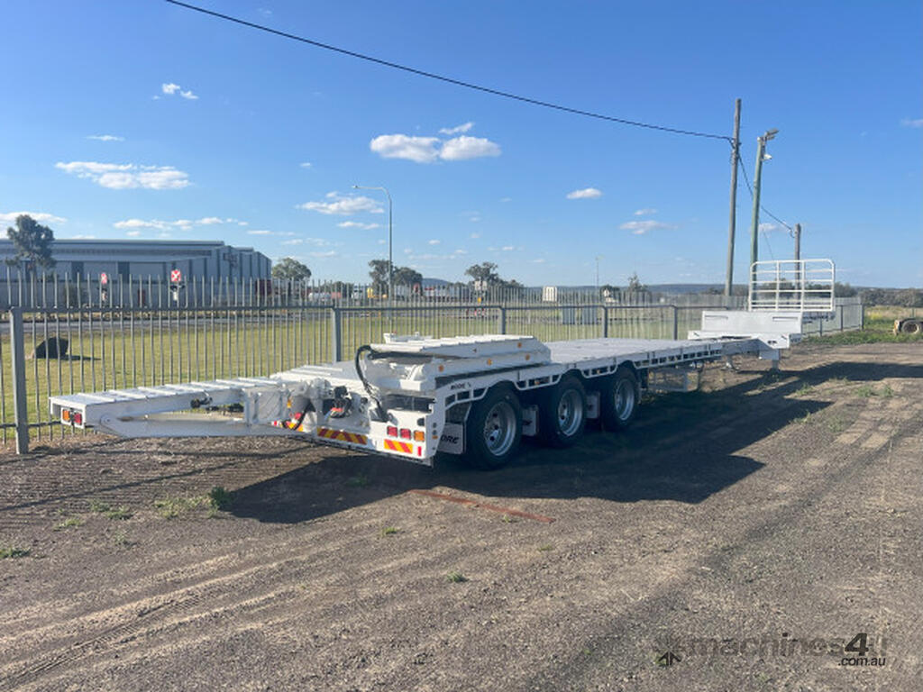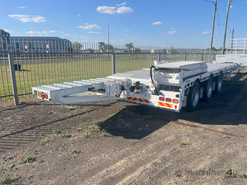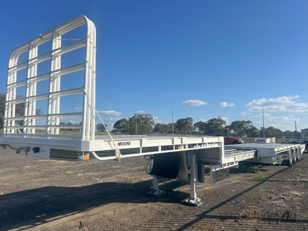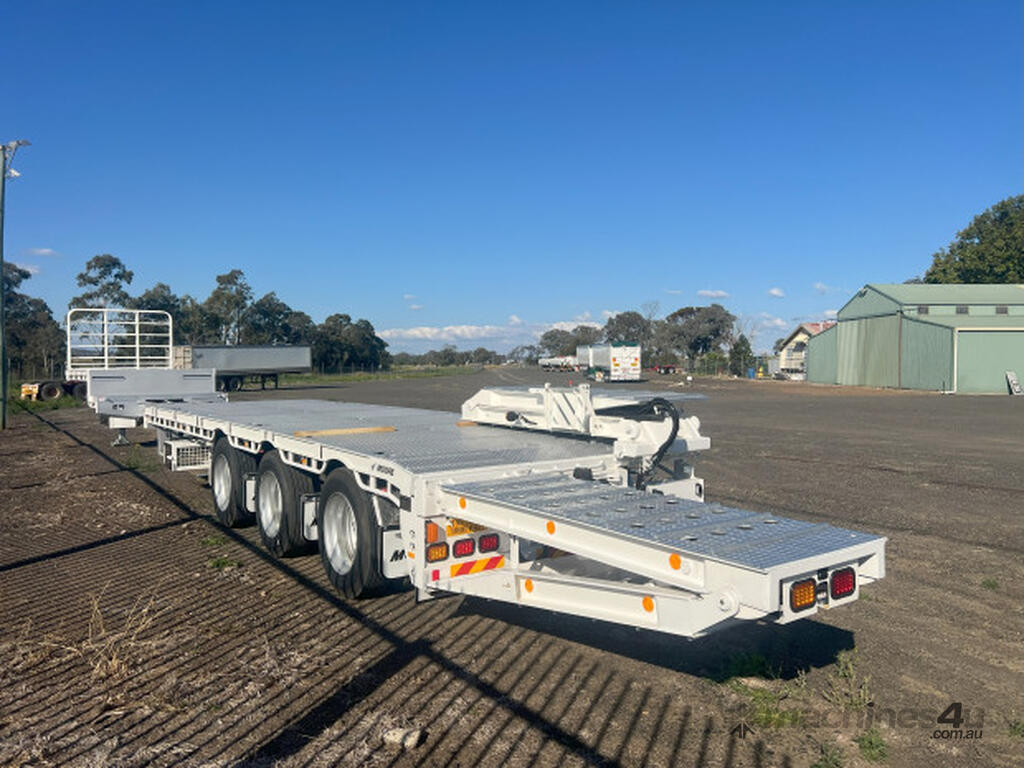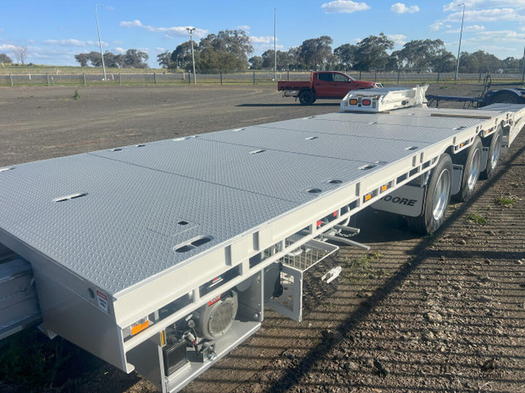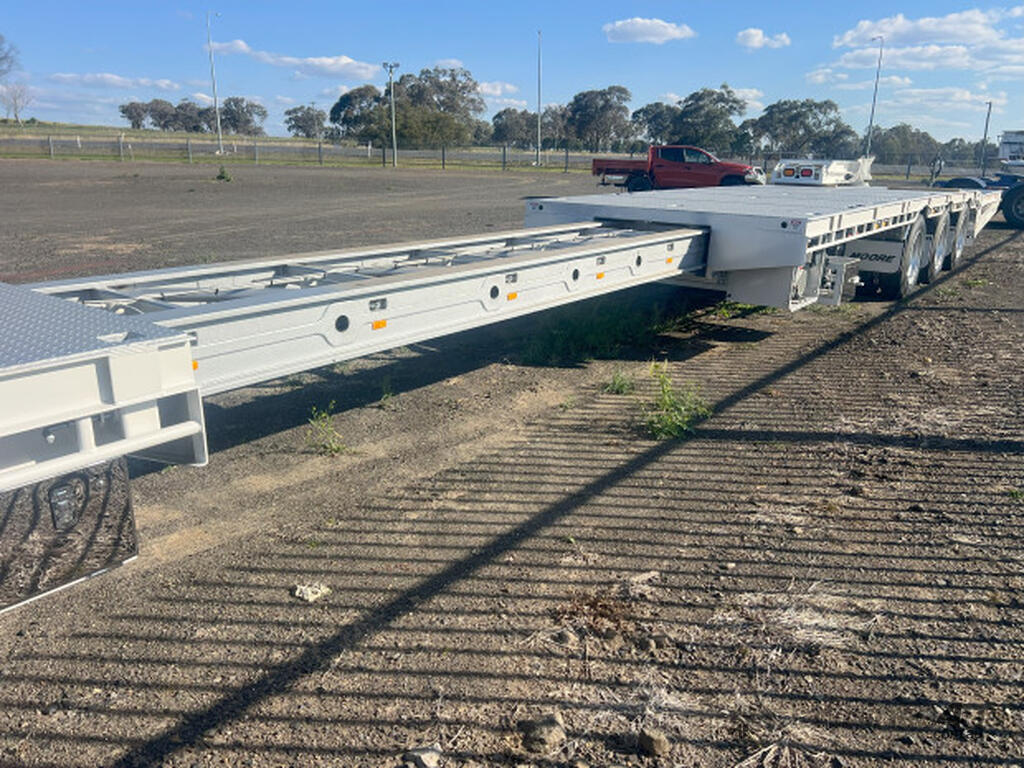 Description: 2025 Moore 45' Triaxle Dropdeck Extendable. 13' Top deck - 32' Bottom deck including ramps. Hendrickson Intraax Suspension and Intraax HXL7 10/285 axles - 1100mm deck height. 275 Tyres on steel rims, 3 Way Container Pins with stands and levelling beam. 14' Bi-Fold Laydown & Layback Ramps using Kubota Diesel Powerpac. 2 Toolboxes, 1 watertank, Timberbox and twin tyre carrier. 4 Pipe Bolsters and storage per side. RIghtweigh Bluetooth scales. Roadtrain lead with coupling. 3mm Checker plate top deck and 5mm Checker plate bottom deck with oval tie downs in floor.