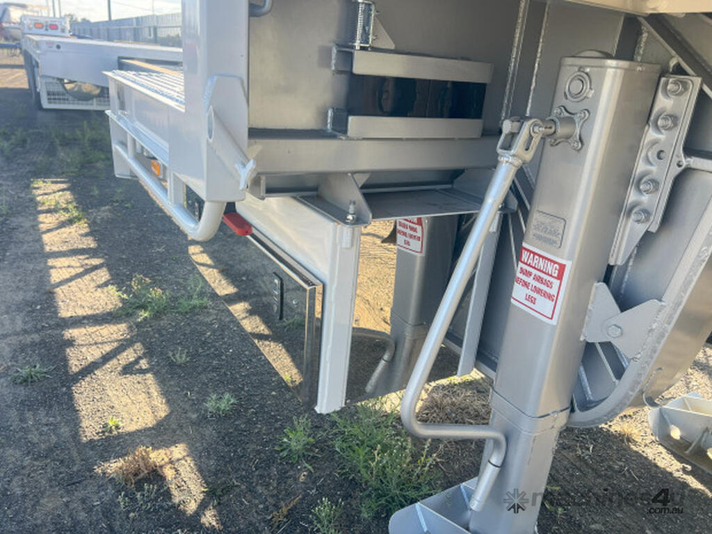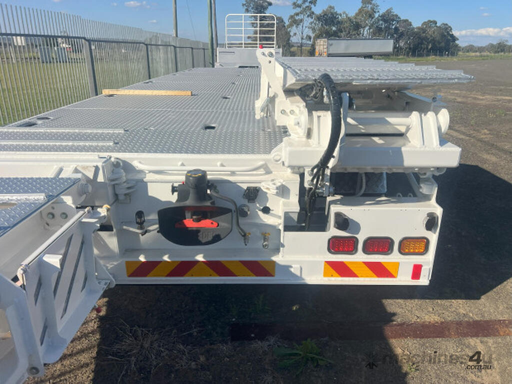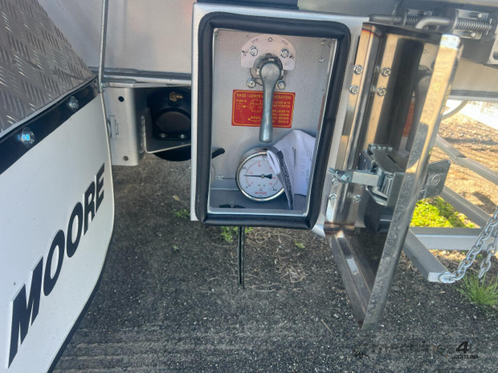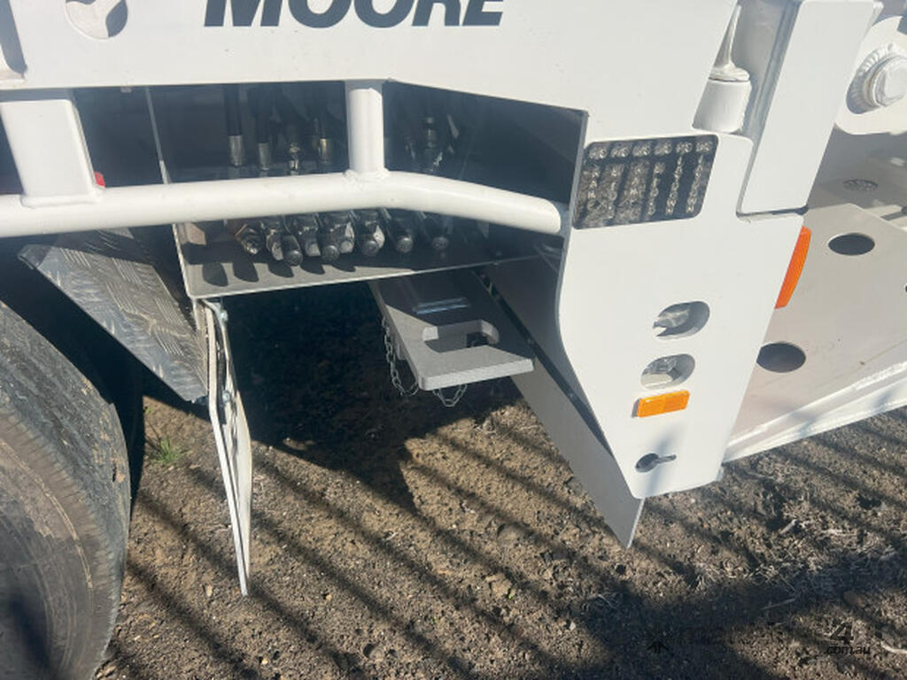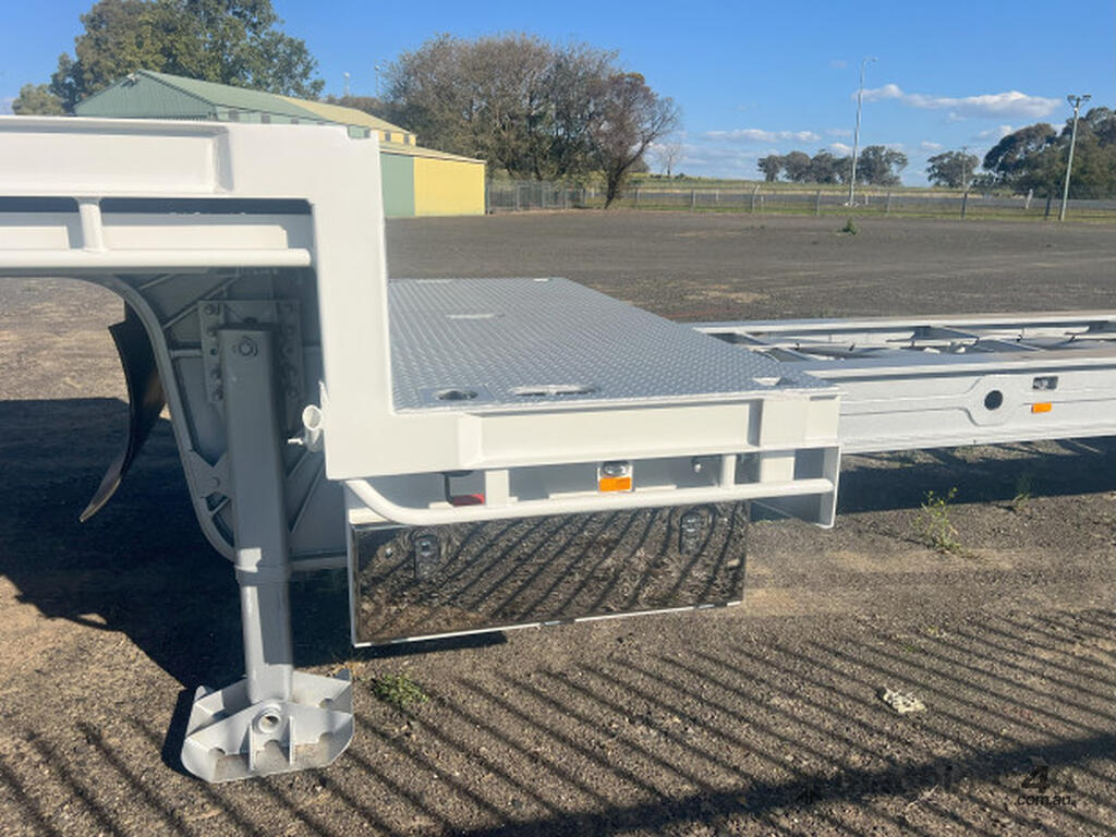 Description: 2025 Moore 45' Triaxle Dropdeck Extendable. 13' Top deck - 32' Bottom deck including ramps. Hendrickson Intraax Suspension and Intraax HXL7 10/285 axles - 1100mm deck height. 275 Tyres on steel rims, 3 Way Container Pins with stands and levelling beam. 14' Bi-Fold Laydown & Layback Ramps using Kubota Diesel Powerpac. 2 Toolboxes, 1 watertank, Timberbox and twin tyre carrier. 4 Pipe Bolsters and storage per side. RIghtweigh Bluetooth scales. Roadtrain lead with coupling. 3mm Checker plate top deck and 5mm Checker plate bottom deck with oval tie downs in floor.