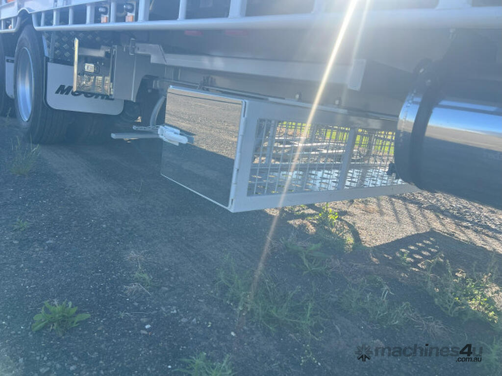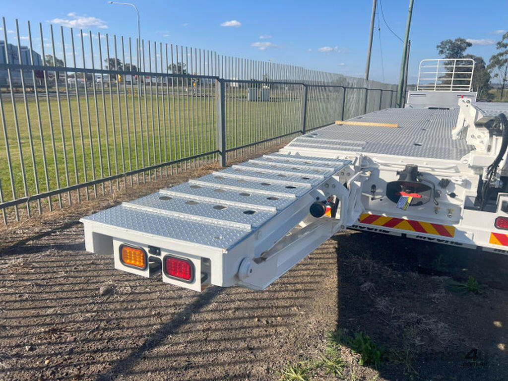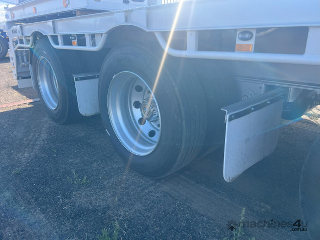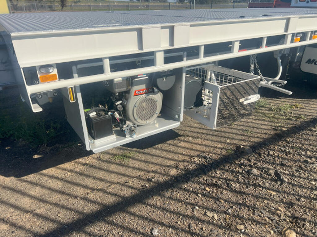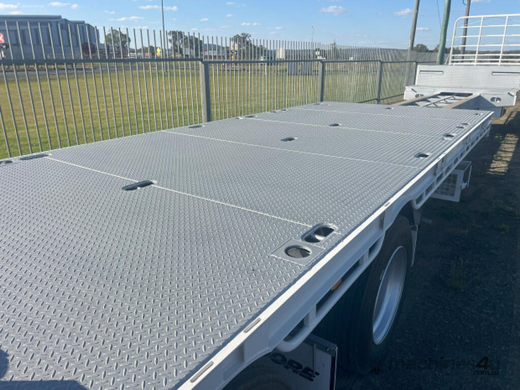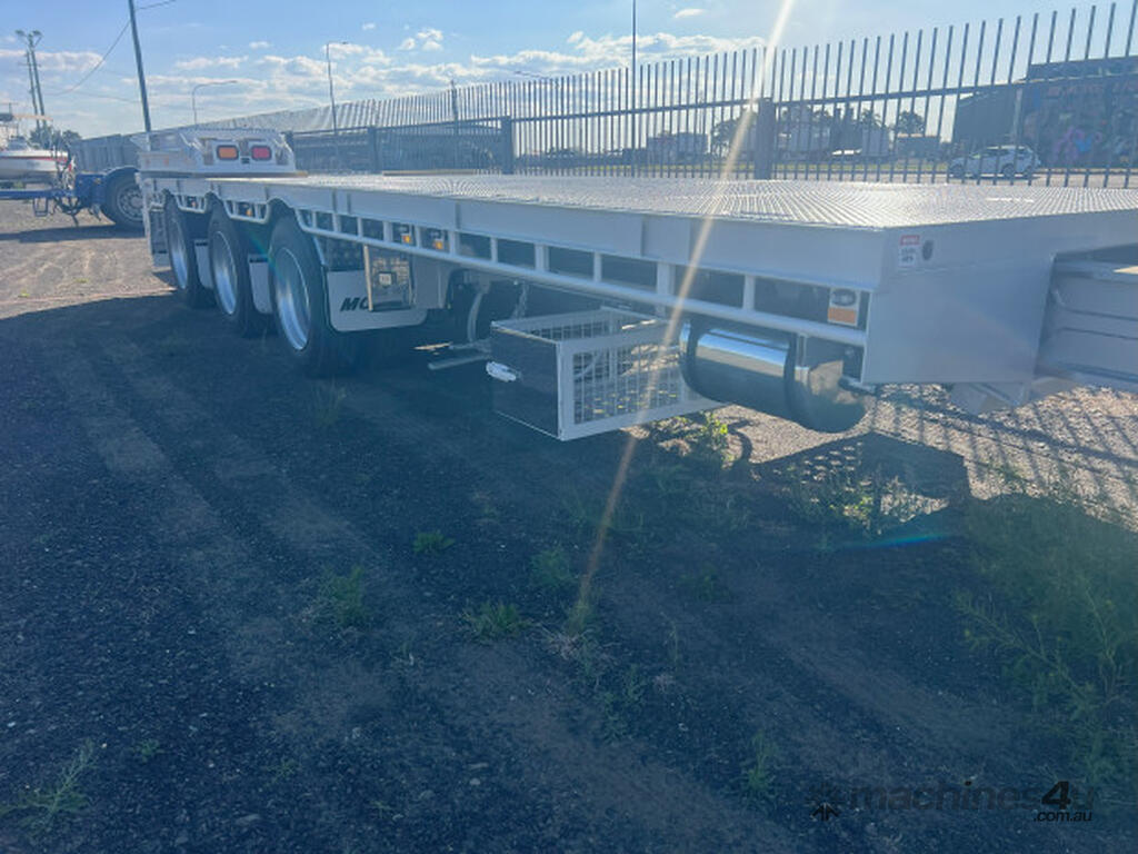 Description: 2025 Moore 45' Triaxle Dropdeck Extendable. 13' Top deck - 32' Bottom deck including ramps. Hendrickson Intraax Suspension and Intraax HXL7 10/285 axles - 1100mm deck height. 275 Tyres on steel rims, 3 Way Container Pins with stands and levelling beam. 14' Bi-Fold Laydown & Layback Ramps using Kubota Diesel Powerpac. 2 Toolboxes, 1 watertank, Timberbox and twin tyre carrier. 4 Pipe Bolsters and storage per side. RIghtweigh Bluetooth scales. Roadtrain lead with coupling. 3mm Checker plate top deck and 5mm Checker plate bottom deck with oval tie downs in floor.