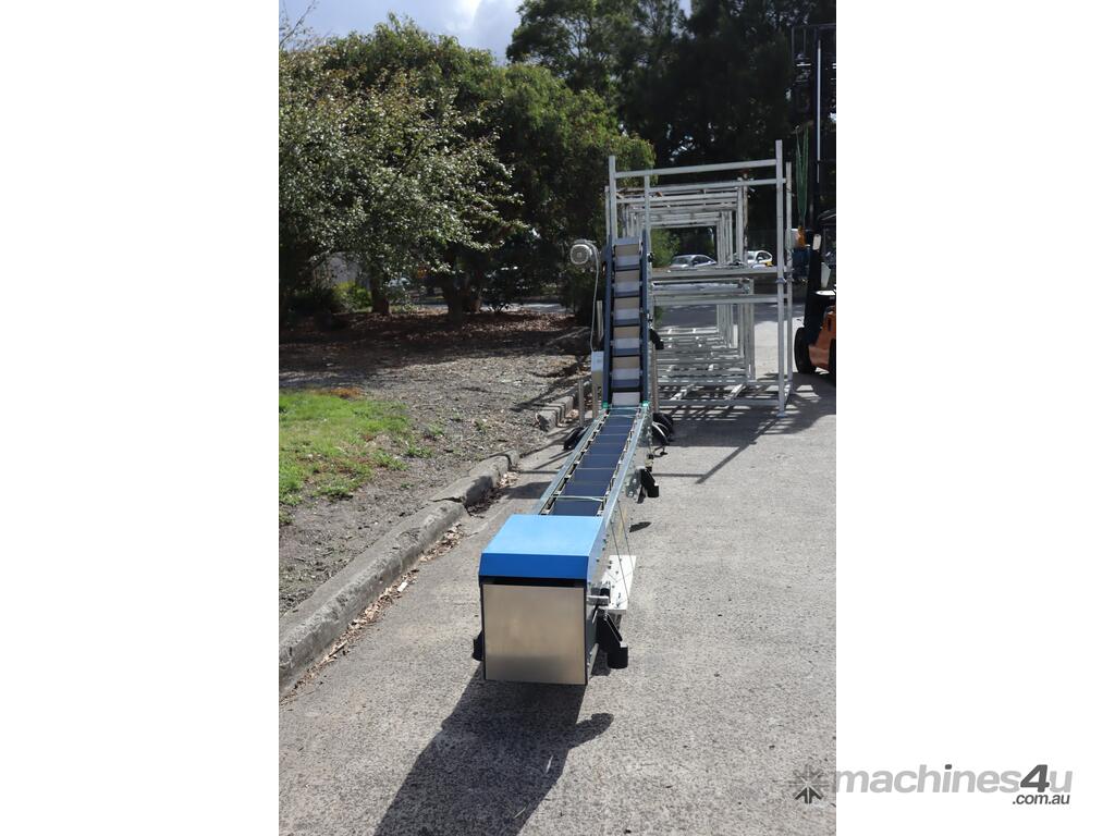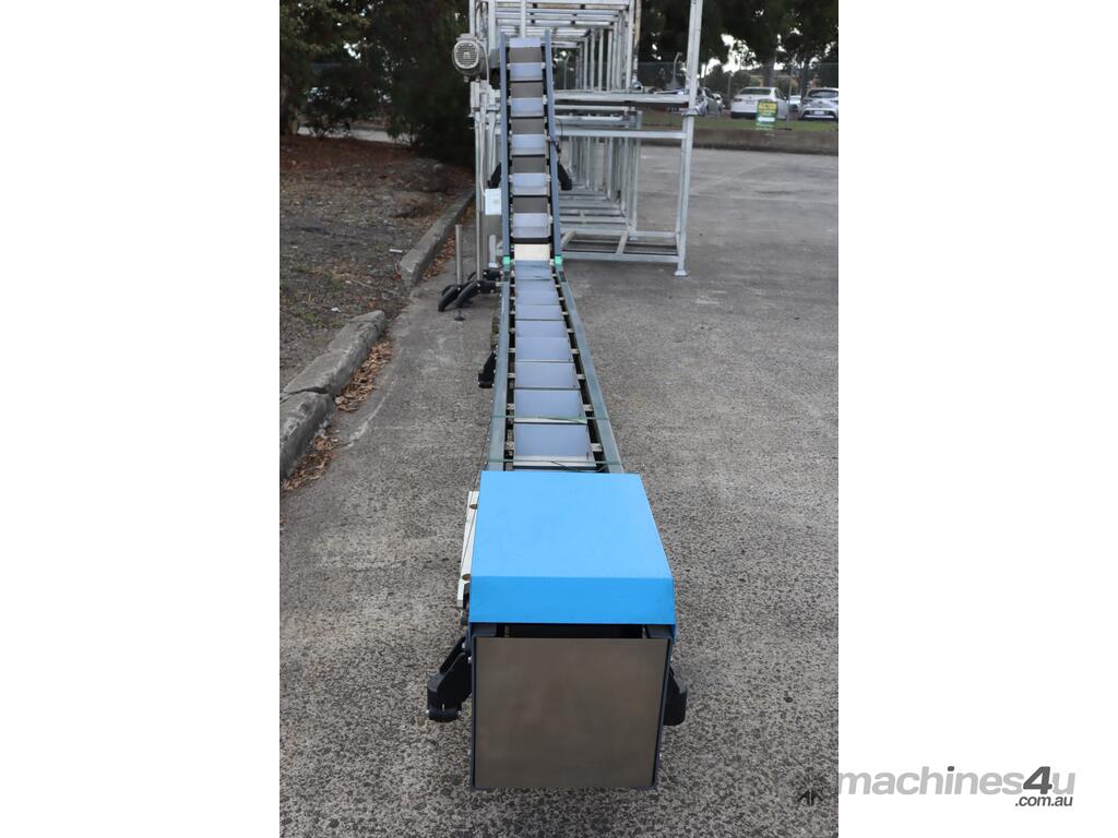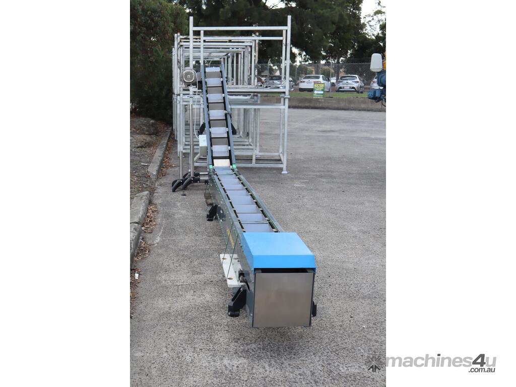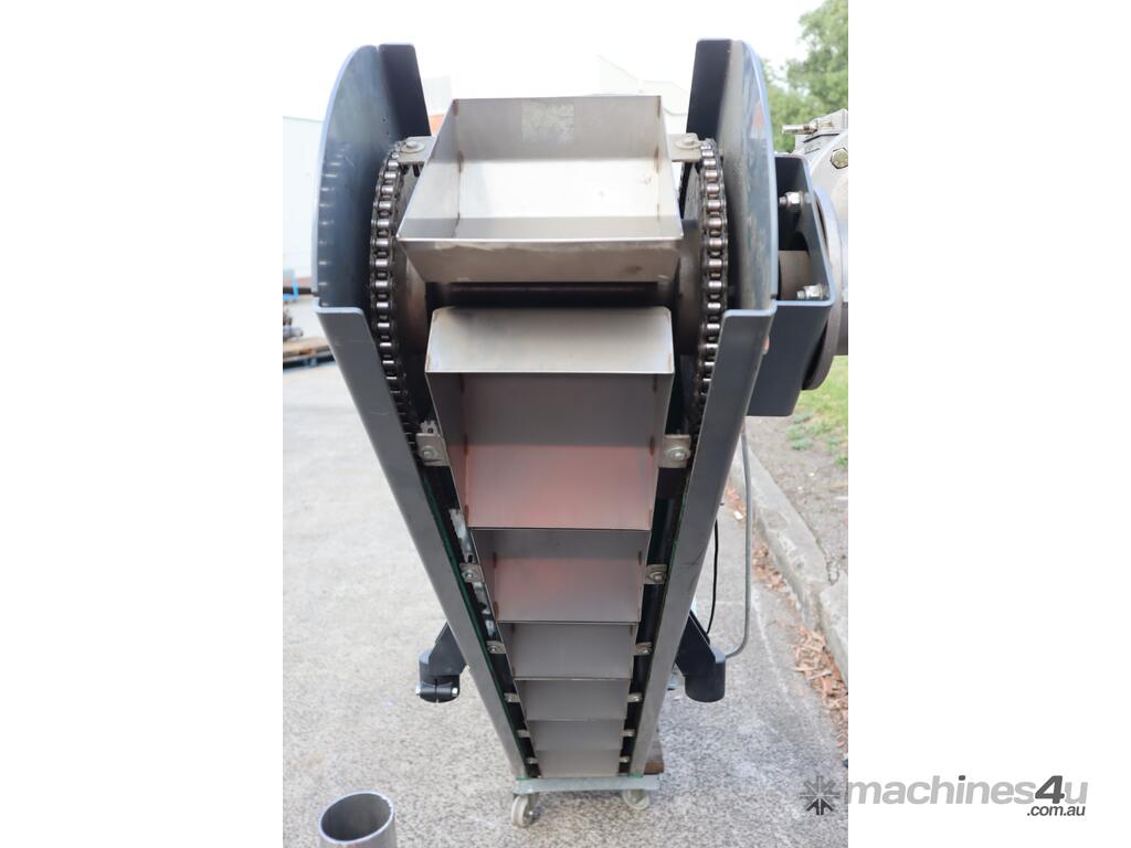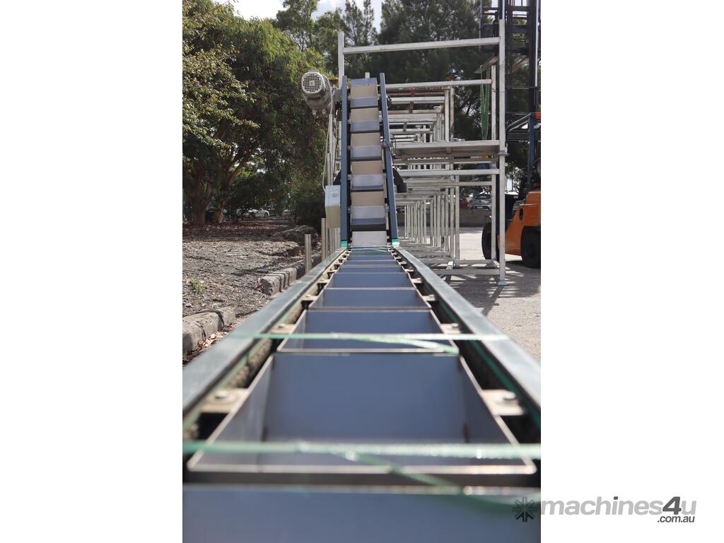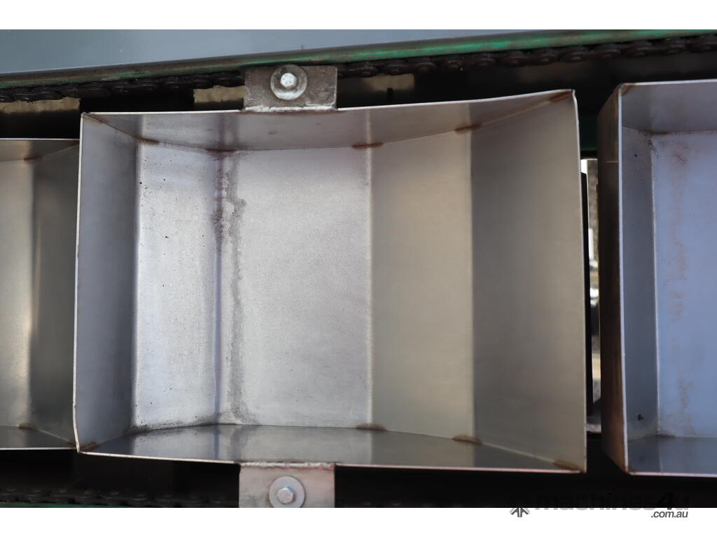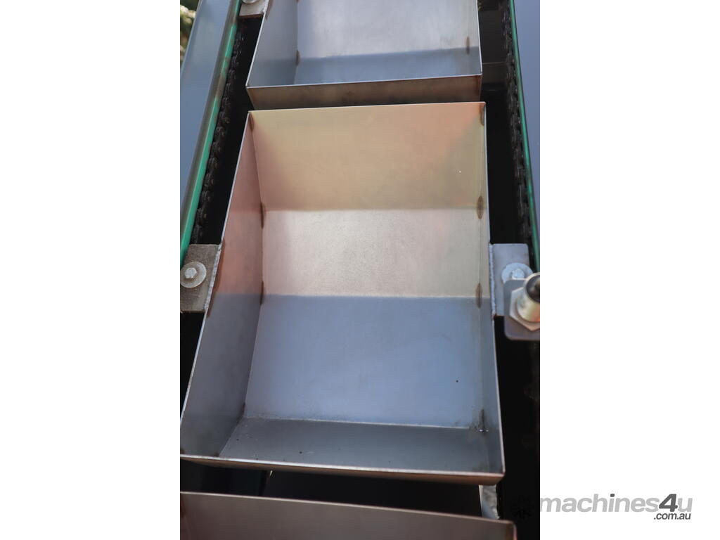 ``Line with bucket conveyor belt; normally used for small parts kits; It also finds application in the food sector with products that cannot easily be dosed automatically. The operator fills the cups manually, the cups move in synchrony with the packaging machine. The cadence can be decided by the operator.``