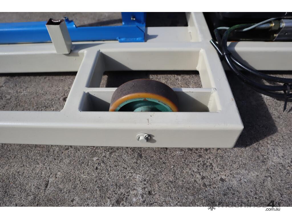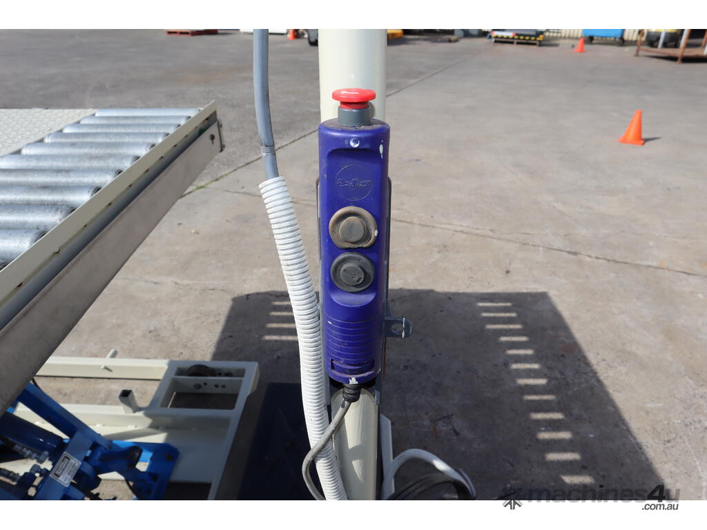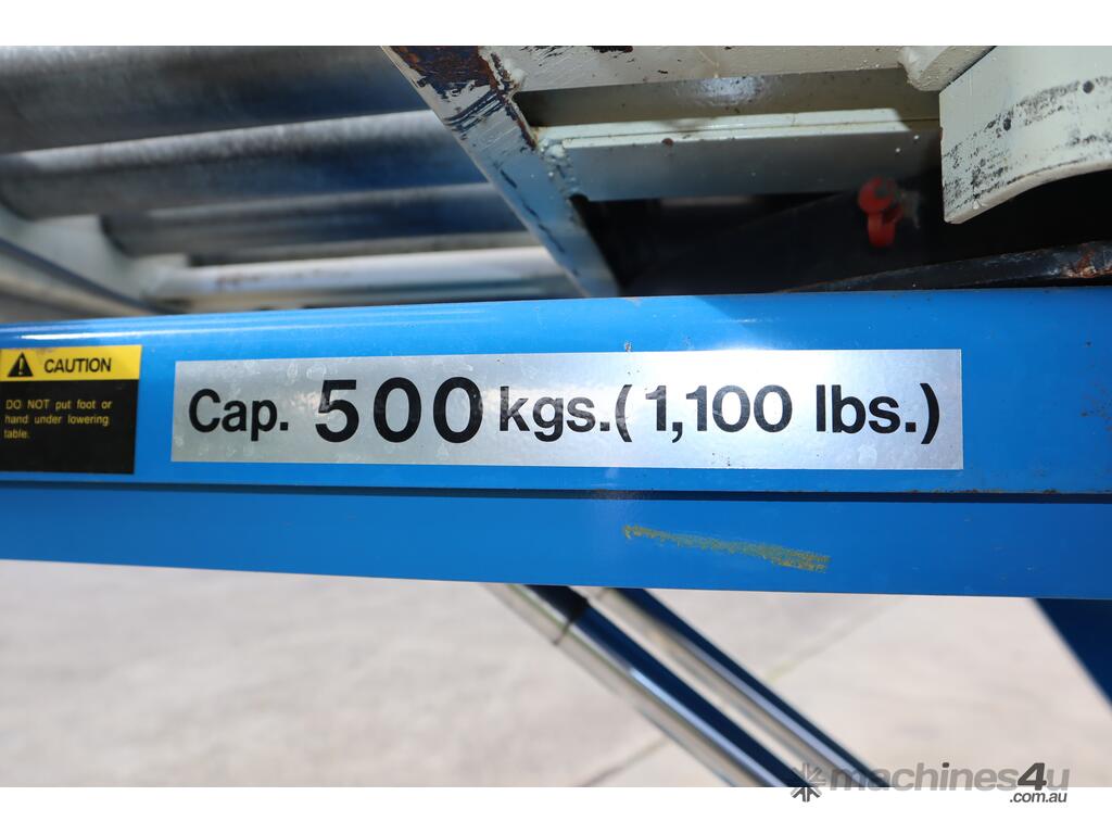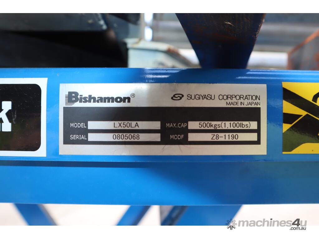 "This Bishamon LX50LA hydraulic scissor lift table is designed for industrial material handling, loading, and unloading operations. Equipped with a roller top, it facilitates the easy transfer of goods, making it perfect for use in warehouses, factories, and assembly lines. The lift table is built for heavy-duty applications and ensures safe and efficient lifting, driven by a hydraulic system powered by a robust motor."