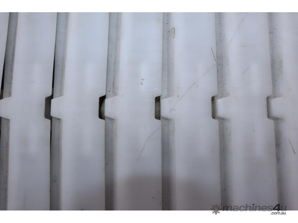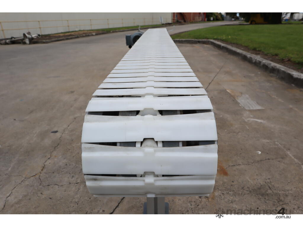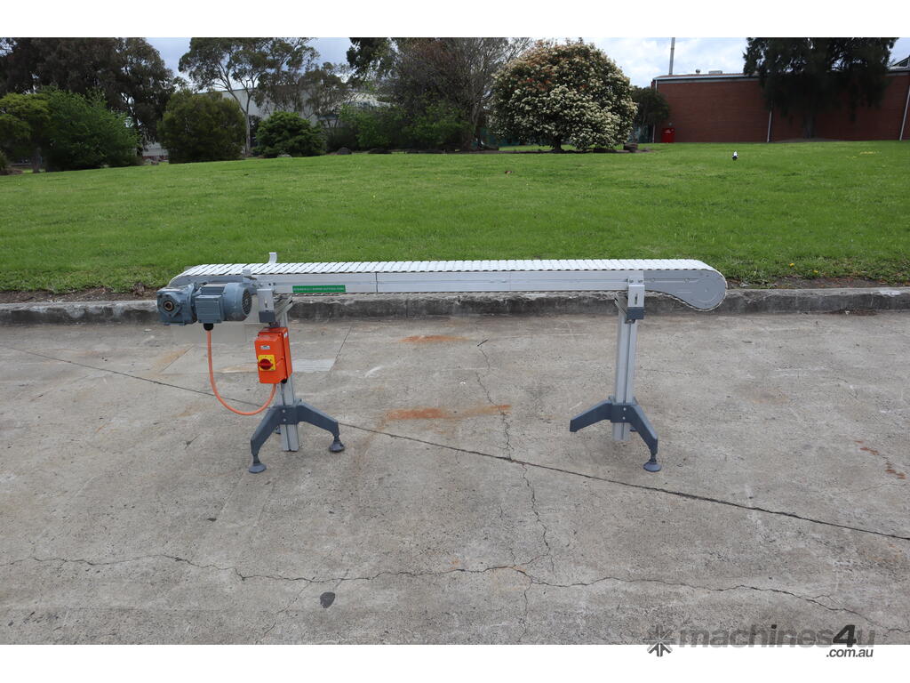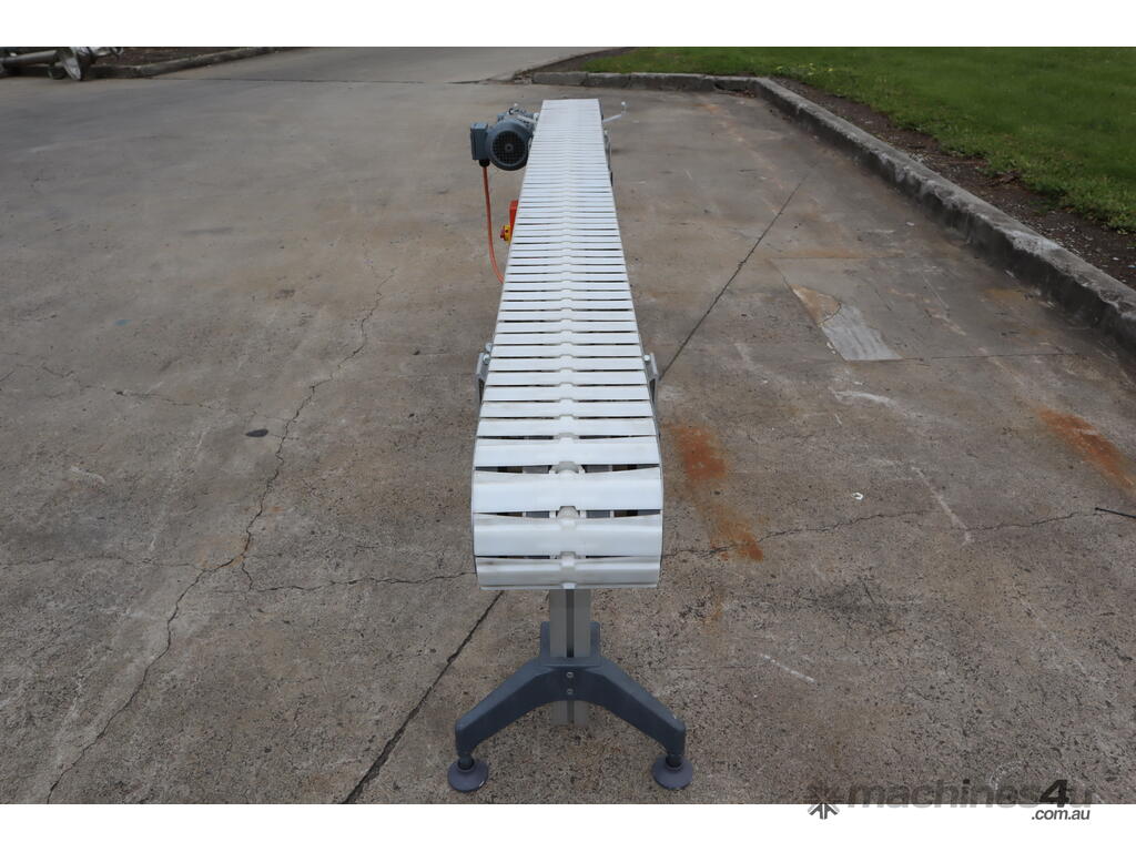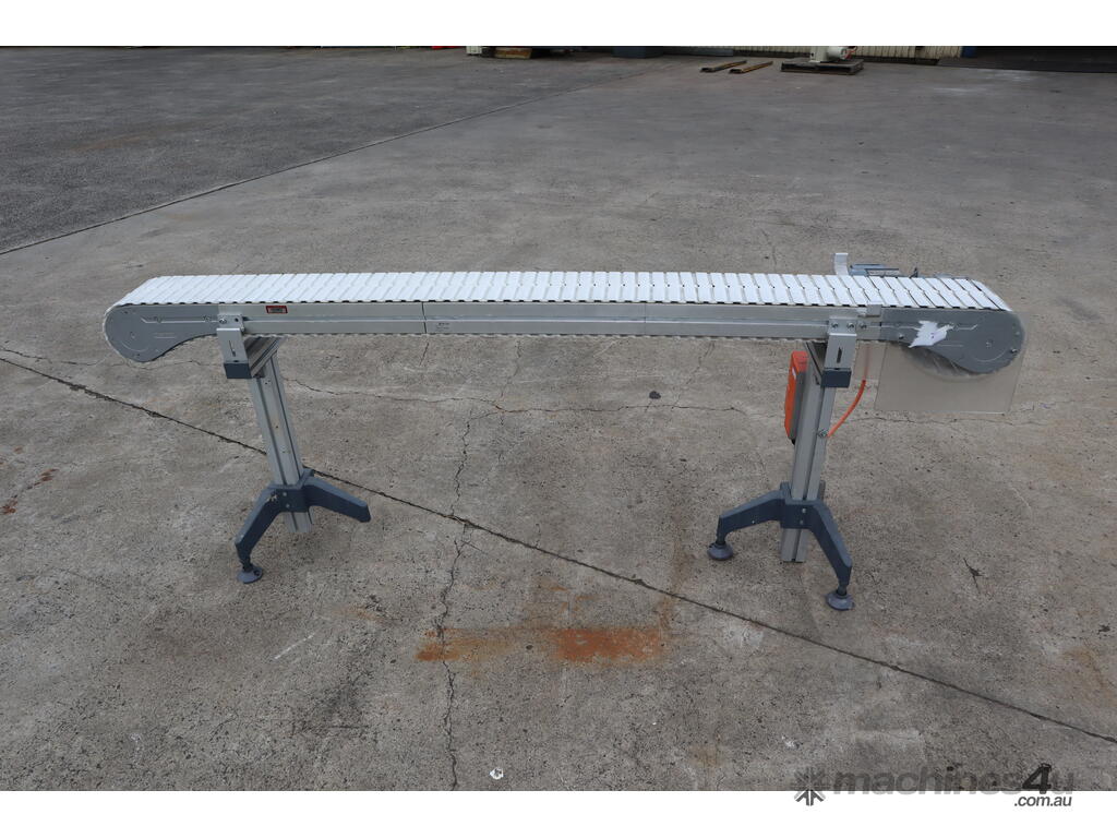 "This FlexLink conveyor system may be ideal for automated material handling in manufacturing, packaging, or logistics industries. It may be used for transporting light to medium-weight goods along production lines, optimizing workflow, and increasing operational efficiency. Businesses in food processing, electronics assembly, or general manufacturing may benefit from its modular and durable design. The conveyor may function by moving items along its plastic link belt, driven by a reliable SEW-Eurodrive motor, making it an excellent addition to any automated assembly line."