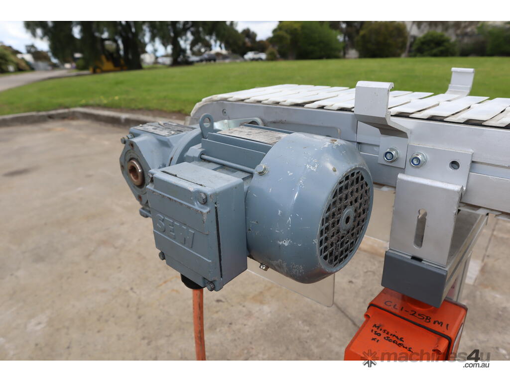 - Description: Industrial FlexLink Conveyor System with SEW-Eurodrive motor and gearbox.