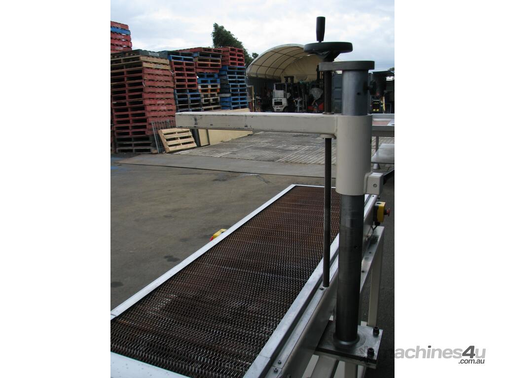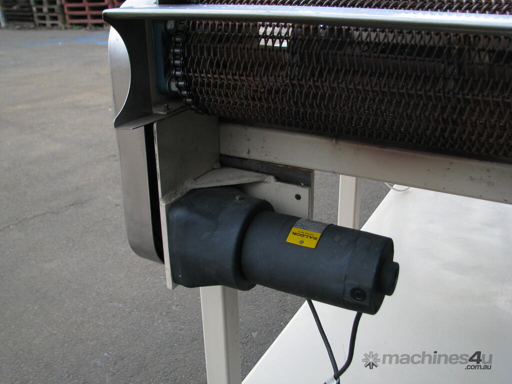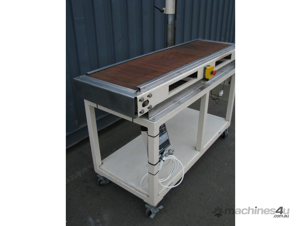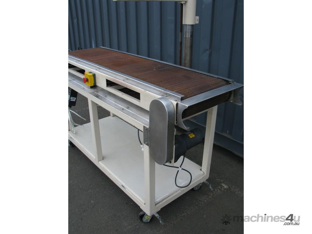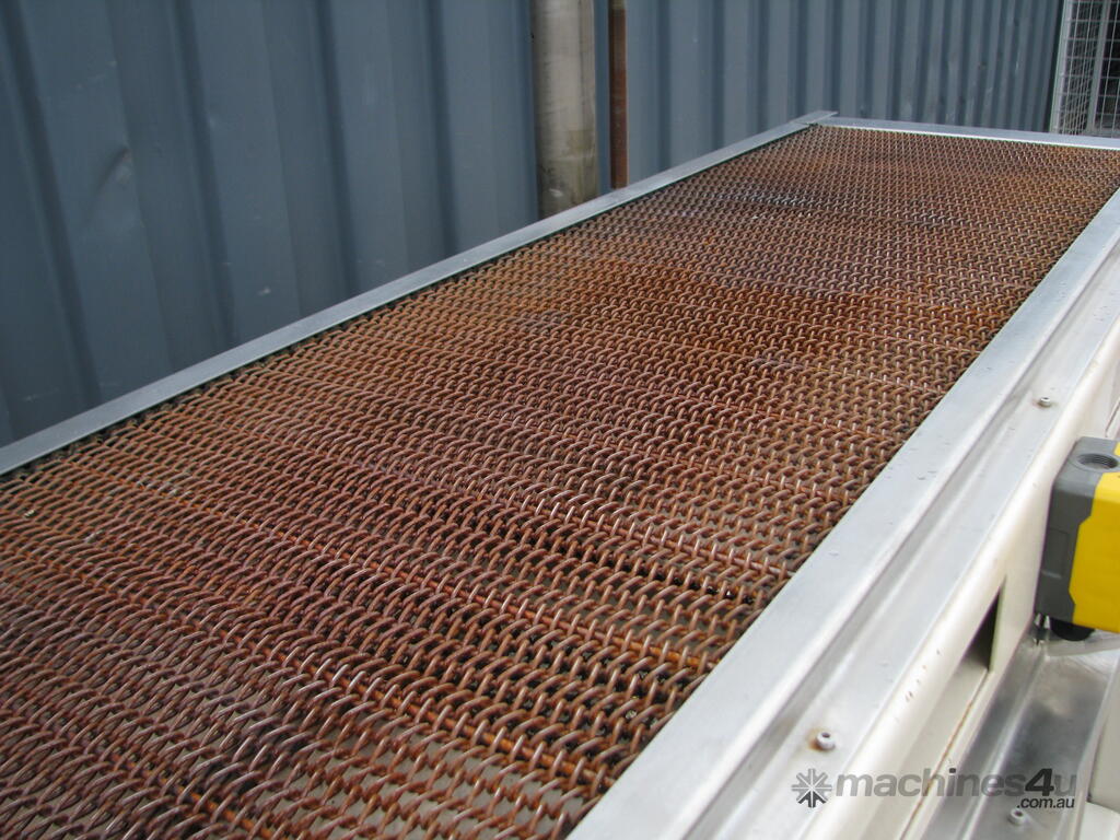 The belt is made from a steel mesh link. The whole conveyor is on castor wheels and can be moved around easily.