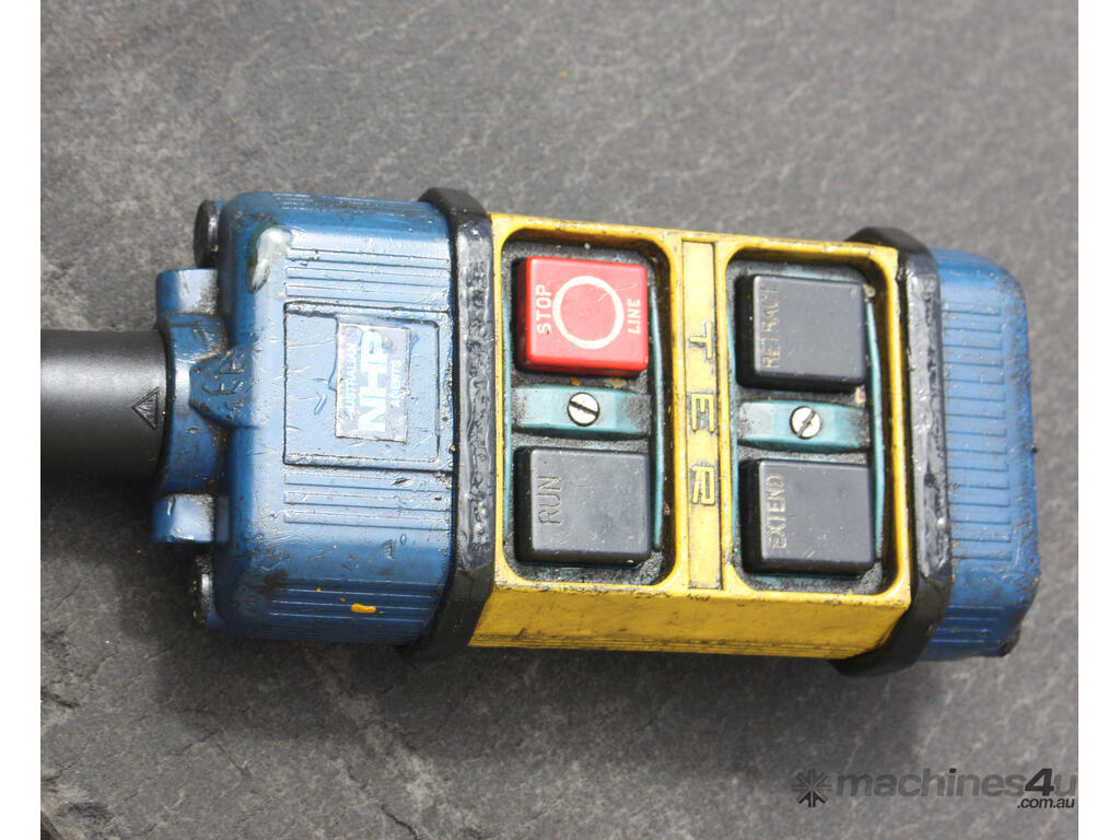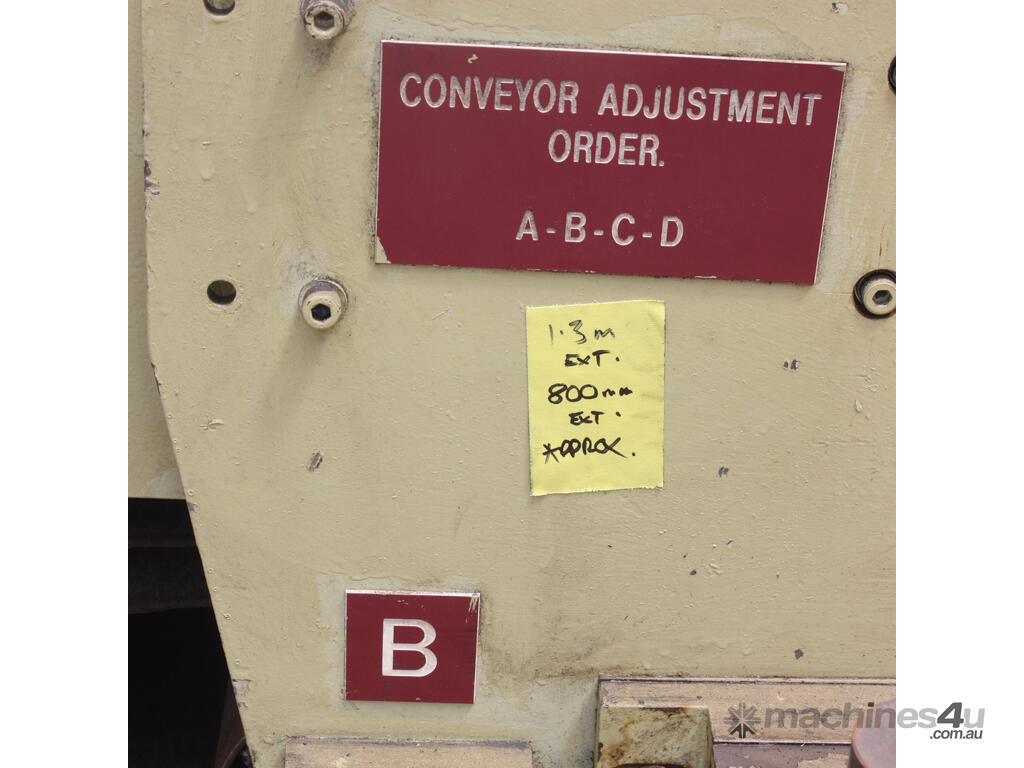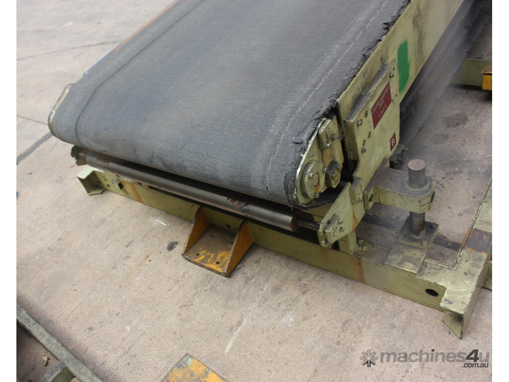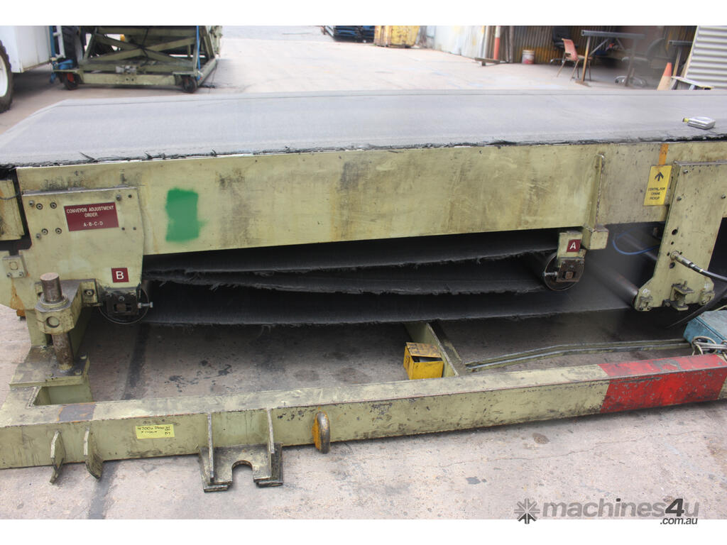 Motorised powered 4.75m (total extended length approx 6470mm) long 1.14m wide rubber belt pneumatic extension conveyor system.