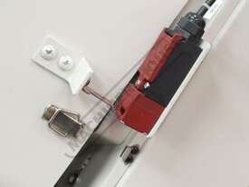 Idle wheel motion proximity switches shuts off machine if blade breaks or slips