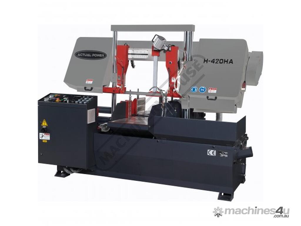 ACTUAL POWER NC Double Column Metal Cutting Band Saw - Automatic Hitch Feed H-420HA-NC Includes Inverter Variable Blade Speed Control, Auto Kerf Compensation, Auto Trim Cut, LCD Touch Screen, Hydraulic Vice Clamping & Hydraulic Downfeed Control 420 x 420mm (W x H) Rectangle Capacity