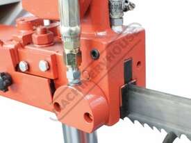Hydraulic operated carbide blade guides with additional ball bearing guides provides superior accuracy and reduce friction for longer blade life