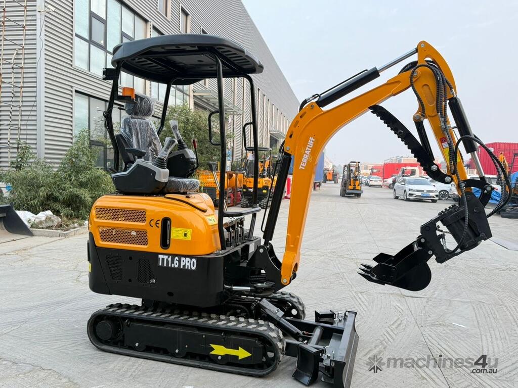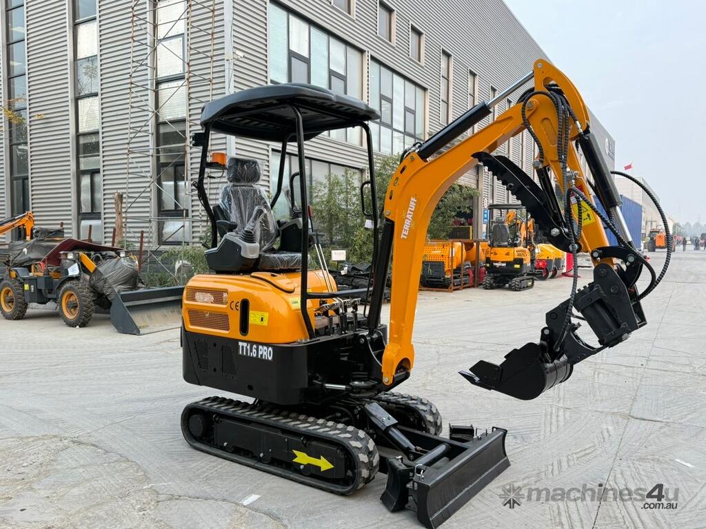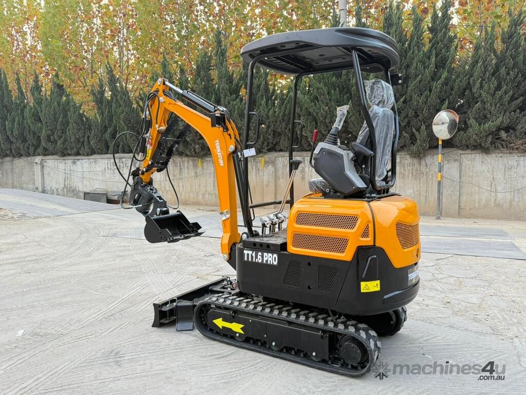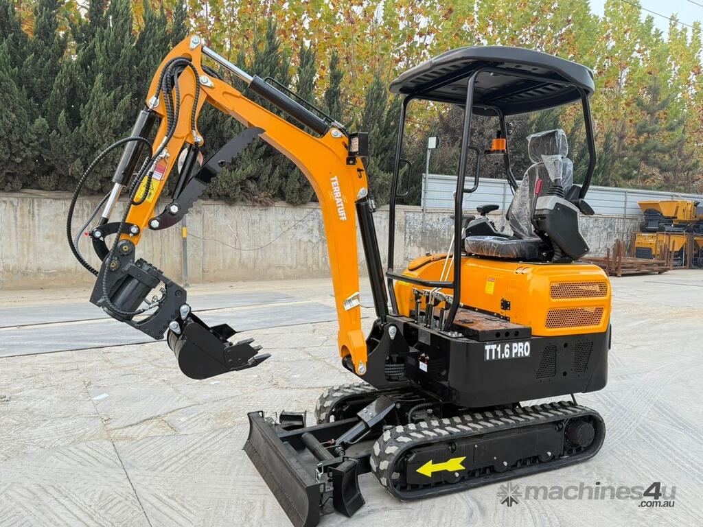 NEW 2025 TeraTuff TT1.6 Pro 1.6T Excavator. Kubota D902 Motor, 16hp, Boom Swing, Hydraulic Tilt Double Hitch with lock, Retractable Track, 2 Speed, Folding Boom, 200 x 72 x 45 tracks, Enclosed Drive Motors. This TT1.6 Pro 1.6T comes with GP Bucket, Ripper, Wood Grab, Auger, Sand Bucket, Hydraulic Thumb Clamp, a set of spare rubber tracks and filters for future services. 2 year factory warranty. All this for only $22,900 plus GST. Take advantage of the tax instant right-off while it's still available.