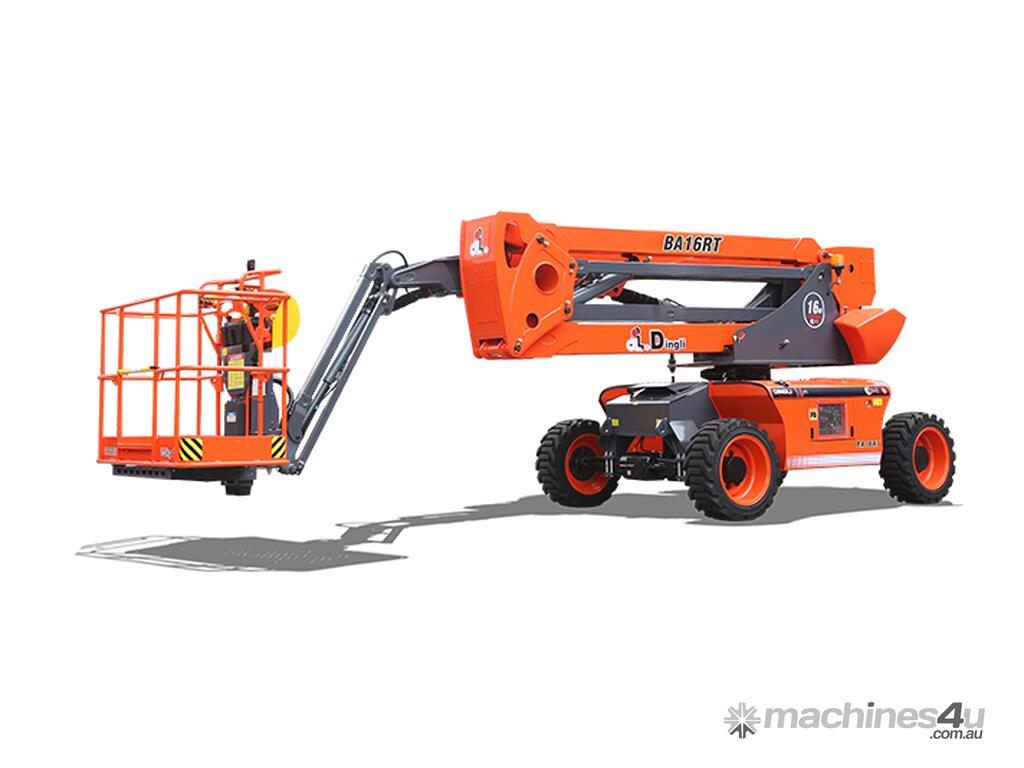 The Dingli BA16RT is a 46ft diesel articulating boom lift designed for construction, maintenance and industrial access. It provides a working height of 52ft 9in (16.07m), 28ft 8in (8.74m) of horizontal outreach and a 1.50m jib for improved up-and-over capability. Its lowered centre of gravity enhances stability and the axle-integrated 4WD system delivers strong rough-terrain performance.