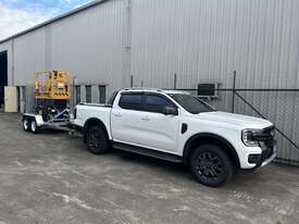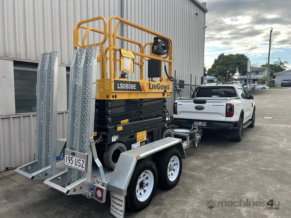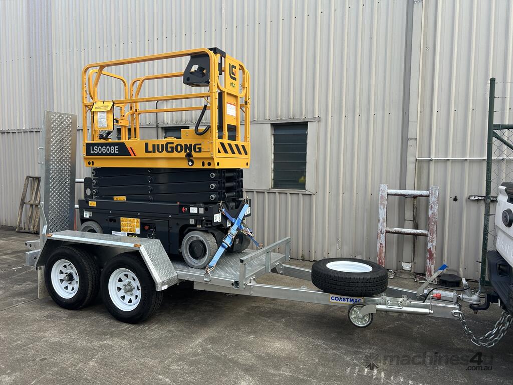 Luigong Australia LSC 0607DE Electric Scissor Lift with 7.8 metre working height and Galvanised PT20 Coastmac 2000kg ATM trailer package.