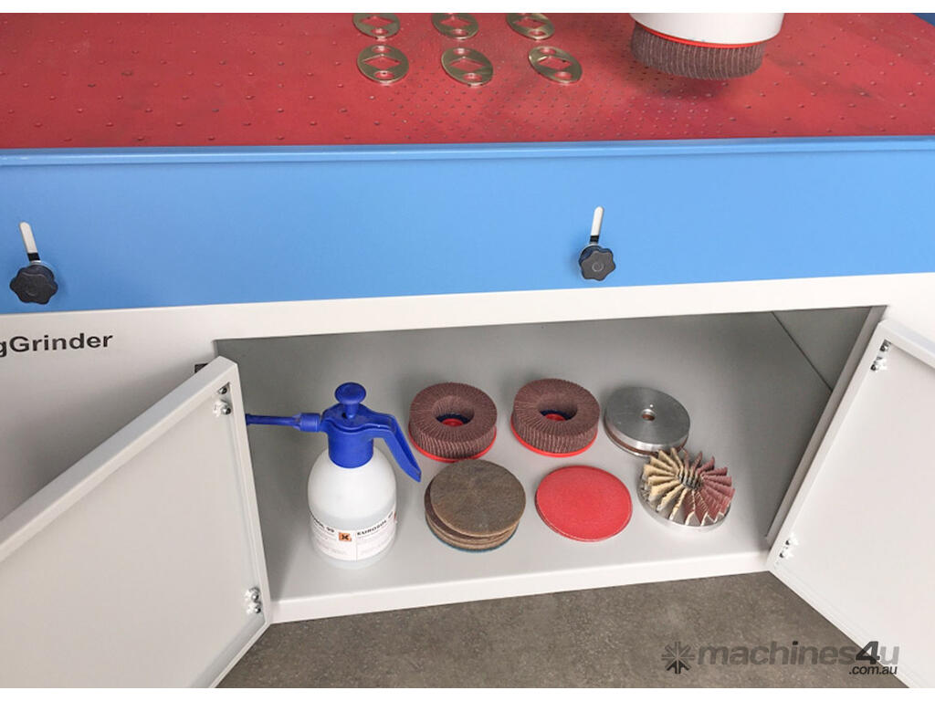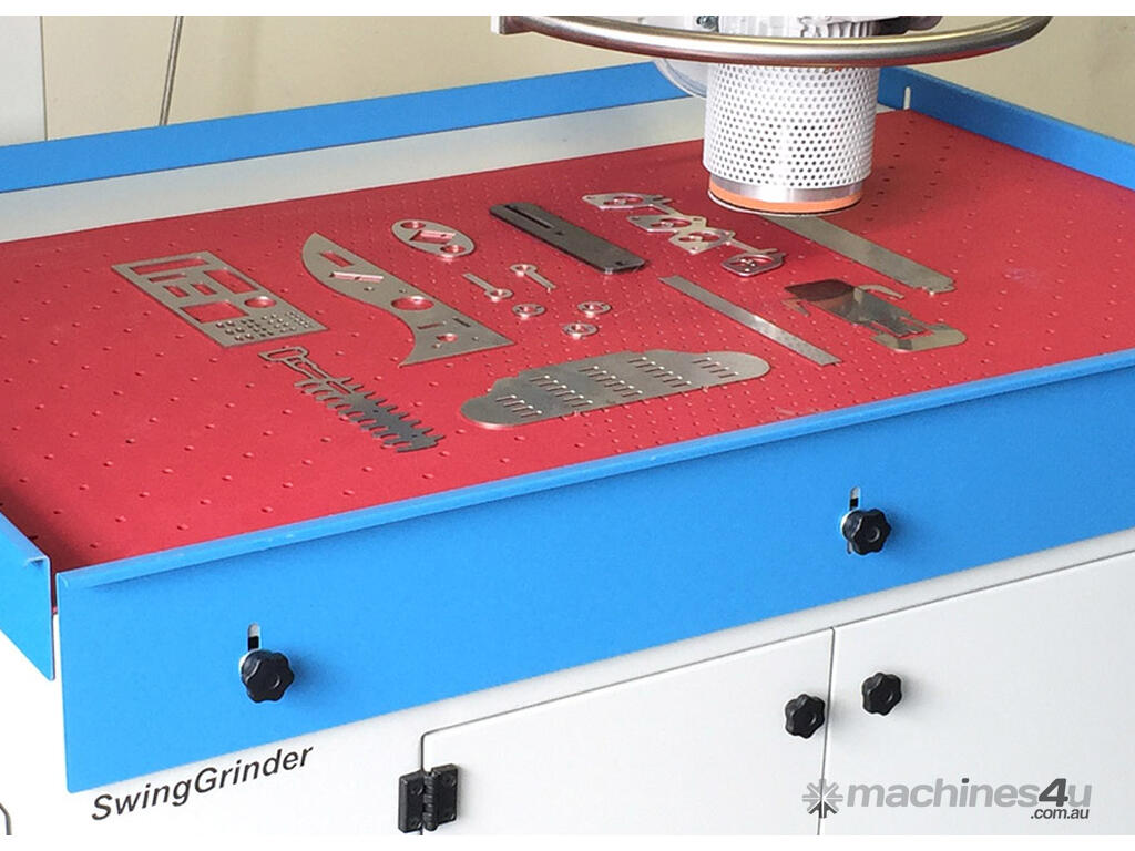 A high grip table with perforations allows the parts to be deburred and the grinding dust to be collected by an easy access draw below the table, so cleaning can be done without tools etc.