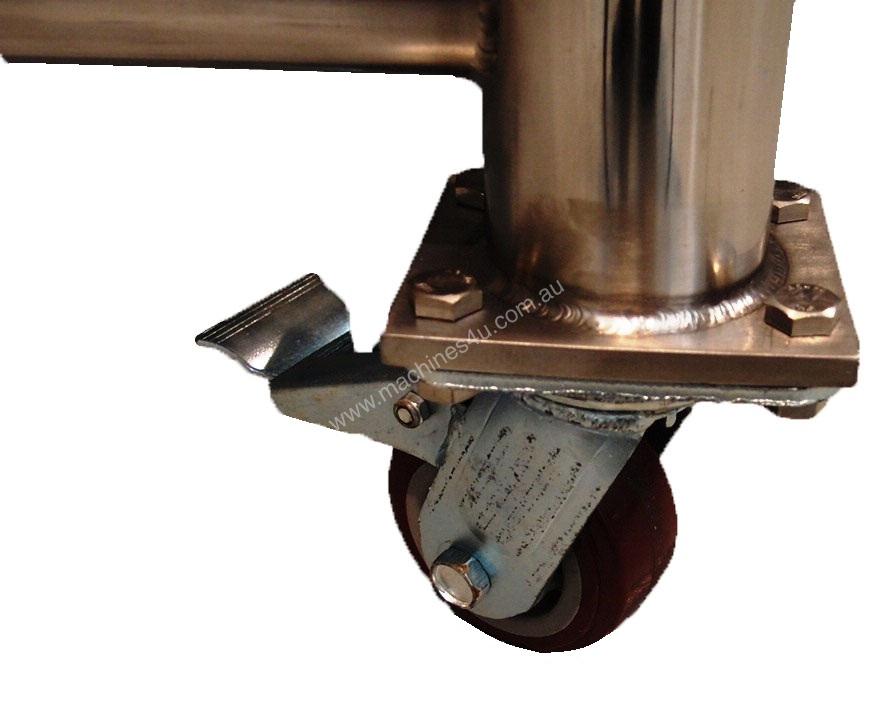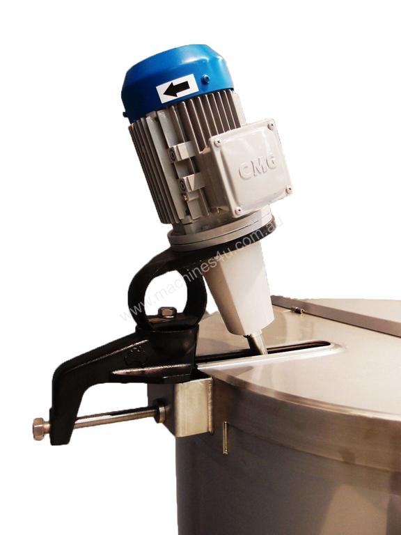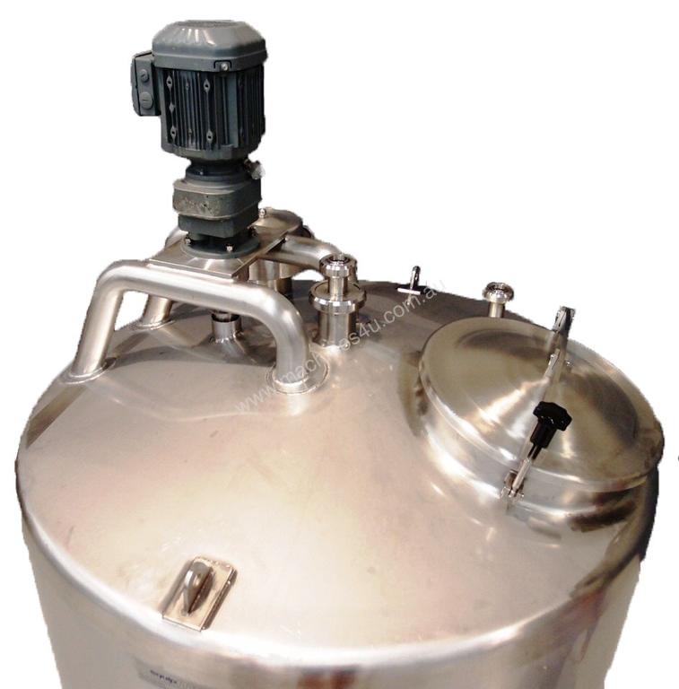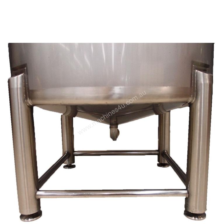 Tank has an enclosed conical top with top mounted 4400mm dia clamped manway. Stainless steel offset pipe bridge with top mounted Sew geared twin paddle agitator (1.1kw 184rpm, 415V). Stainless steel center mount spray ball, top mounted product infeed tube, top mount stainless steel vent. 15 degree conical bottom with 50mm dia center discharge with BSP male fitting. Stainless steel polished legs with cross bracing on compensation pads and adjustable feet.