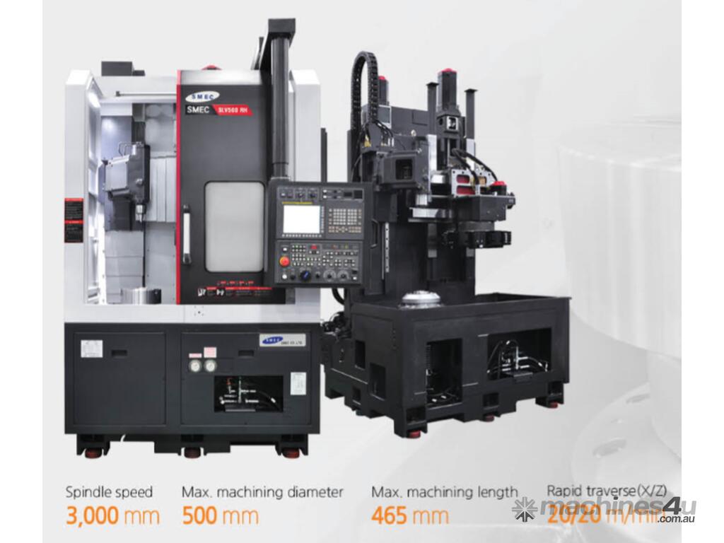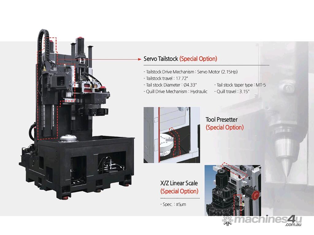 Korean Made CNC Vertical Lathe with solid slides including optional C axis Live Tool capabilities, fanuc control system, designed for rigidity and performance.