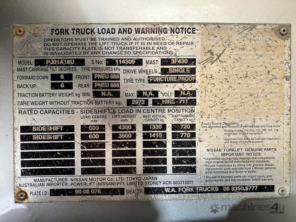 Now available from our Perth Yard, this Nissan PJ01A18U 1.8 Tonne LPG Forklift is a clean, workshop-prepared unit fitted with a 4.3m triple stage container mast and hydraulic sideshift.