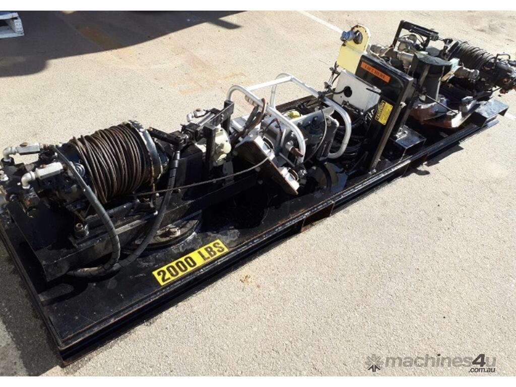 Dual pivoting air powered winches with auto tensioning and fail-safe stopping.