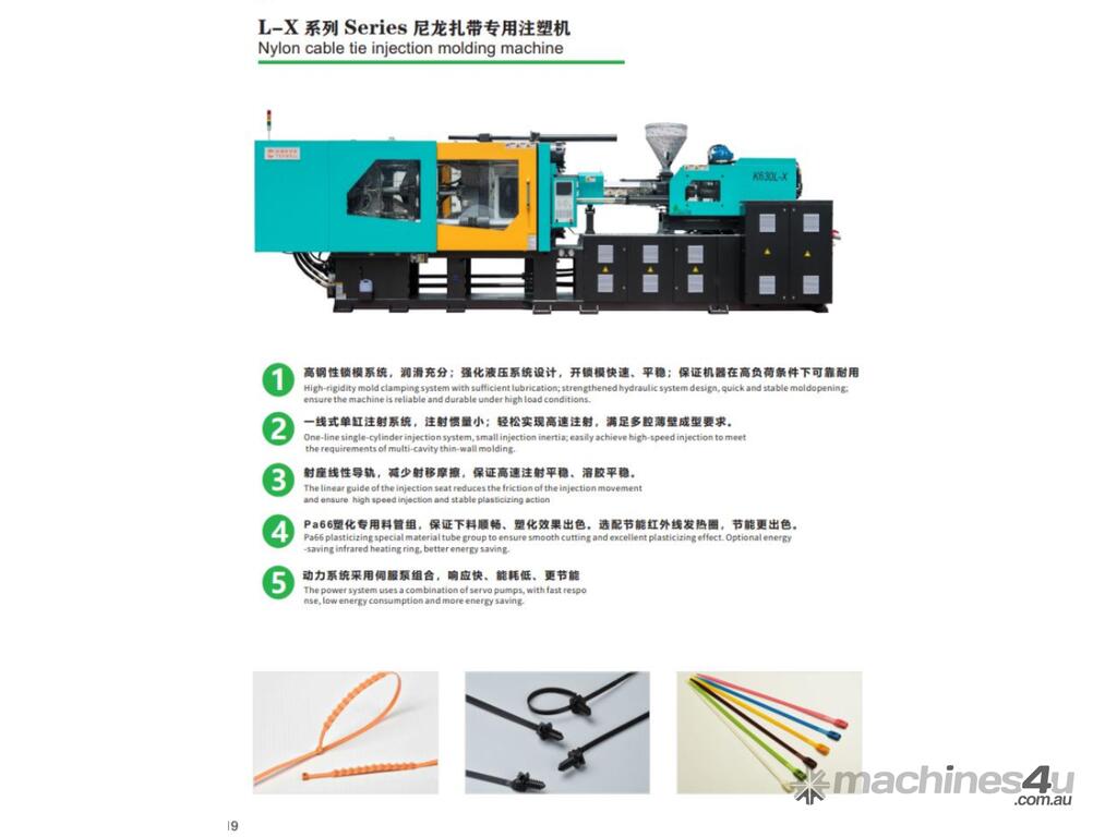 TEKWELL MACHINERY OFFERS THE L-X SERIES SERVO DRIVE ENERGY SAVING INJECTION MOUDLING MACHINE FOR MAKING NYLON CABLE TIE RANGING FROM 470 TONS TO 1100 TONS CLAMPING FORCE.