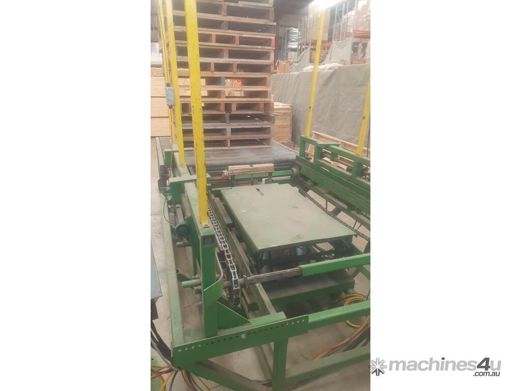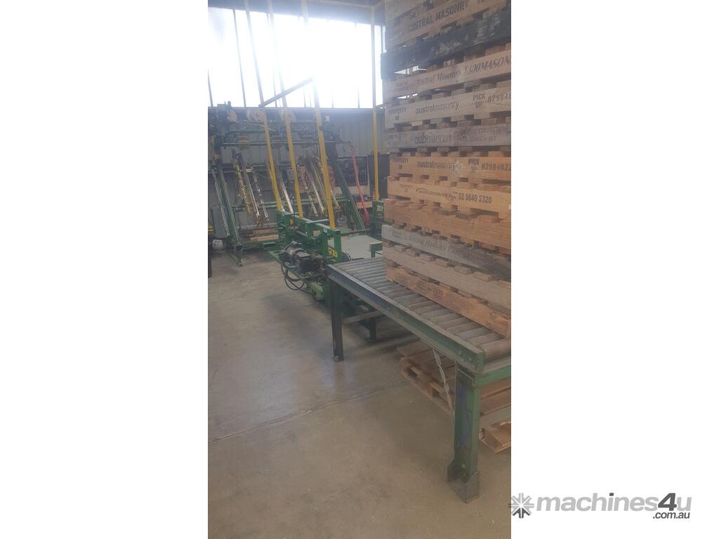 currently set up to do 1165x1165 pallets, can do other sizes by resetting the jig, capable of 250 plus pallets per day,