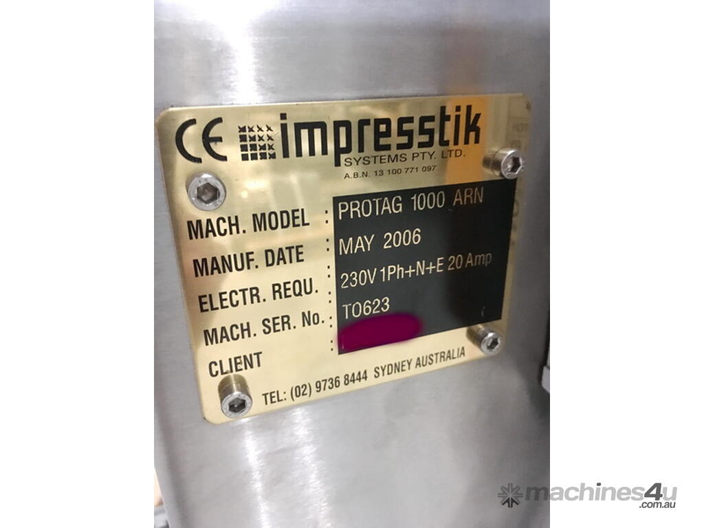 Impresstik Model Protag 1000ARN Neck Tag Labeller. Promotional neck tag application system. Allen Bradley Panel 600 Controls Reeltek Program. Voltage 230 1 phase. Year 2006.