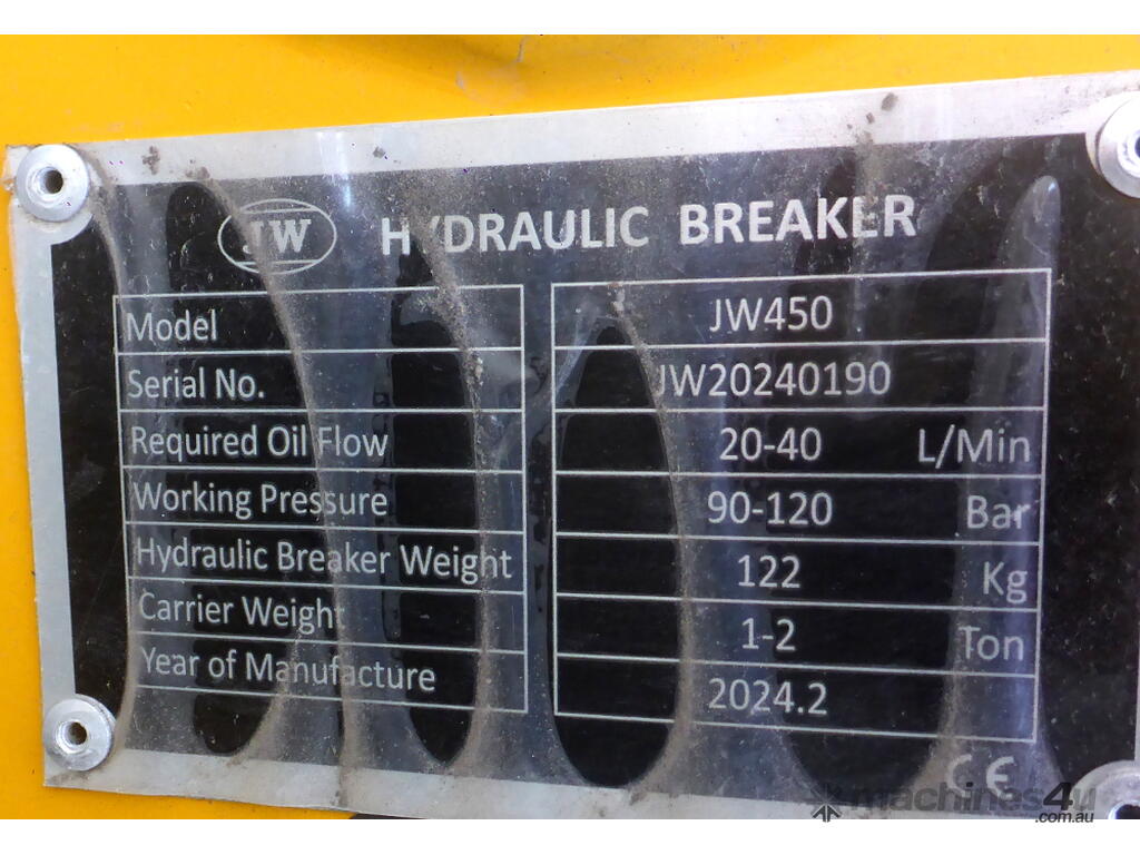 New Jea Wen JW450 Excavator Hydraulic Hammer Rock Breaker to suit: 1.5-4 ton machine. Great for loosening and breaking up rock, rocky ground, concrete, tarmac, paved areas, demolition etc.