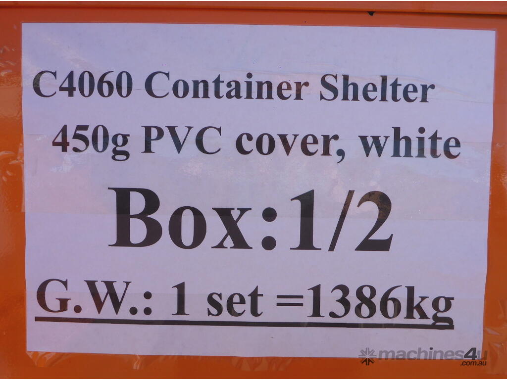 Model C4060, 40 x 60 feet, 15 feet high or 12m wide x 18m long x 4.5m high (plus the height of the containers), covers 2400 square feet or 223m2.