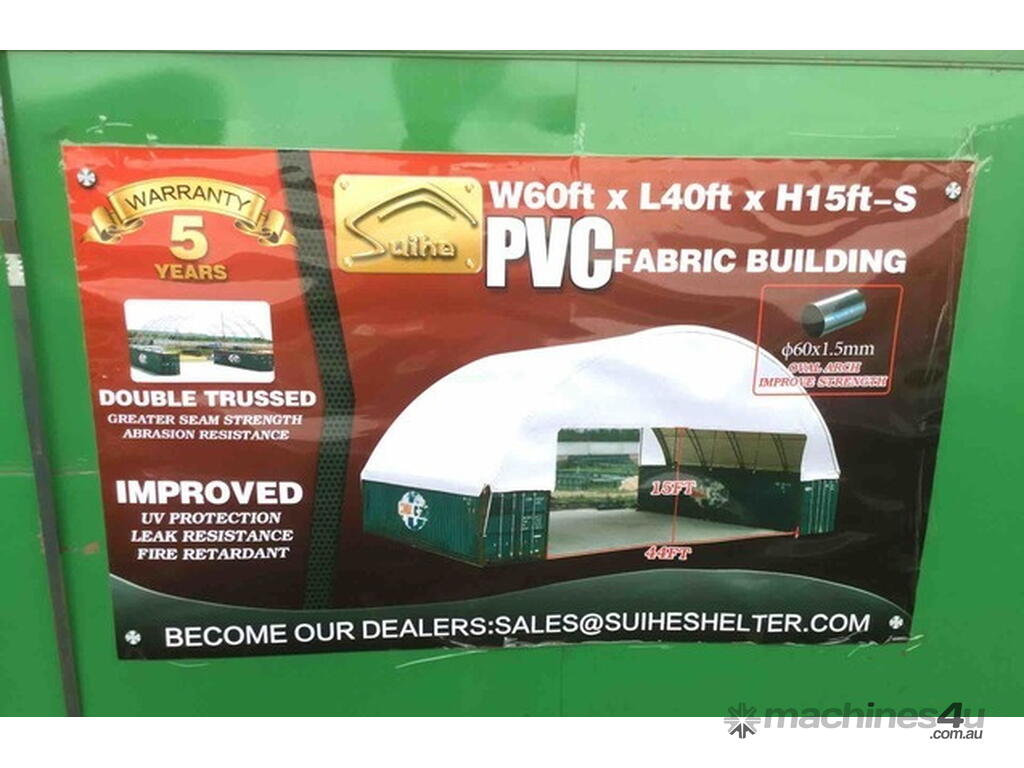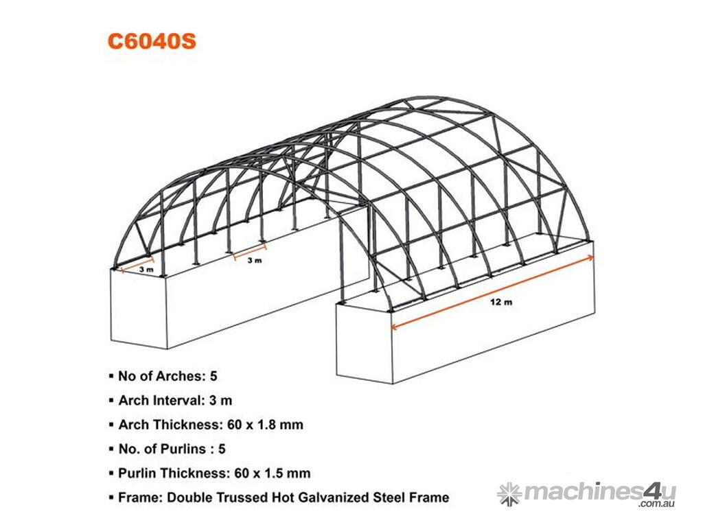 Model C6040S, 60 x 40 feet, or 18.3m wide x 12m deep, covers 2400 square feet or 216m2. This same model is available in two different heights: 15 feet (4.5m) high or 20 feet (6.0m) high (plus the height of the containers).