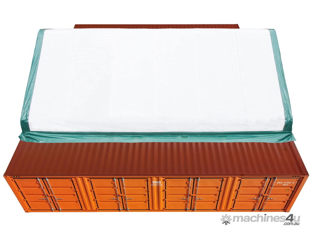 Model TMG-ST3041CVF, 30 x 39.4 feet x 10 feet high or 9.15m wide x 12m deep x 3m high (plus the height of the containers), covers 1200 square feet or 110m2.