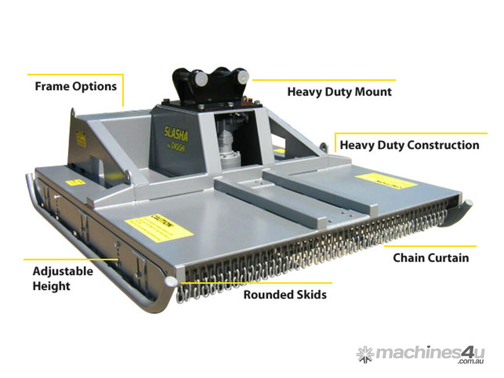 The Slasha with excavator mount is a slashing attachment for Excavators and Skid Steer Loaders that can be used for the effective cutting and clearing of grass and low ground shrubbery. Slashas are ideal for excavators with flows up to 100lpm as well as skid steer loaders and tractors. Slashas come complete with hoses, couplers, and hitches to suit your excavator. Usage includes landscaping, agriculture, roadway maintenance, parks maintenance, and general slashing.