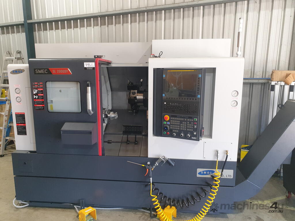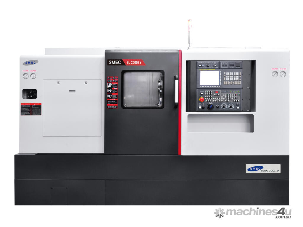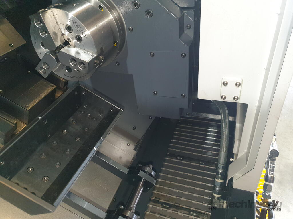 - Korean Made CNC Slant Bed Lathe with solid slides including Sub Spindle, Y axis and C axis Live Tool capabilities, fanuc control system, designed for automation, rigidity and performance.