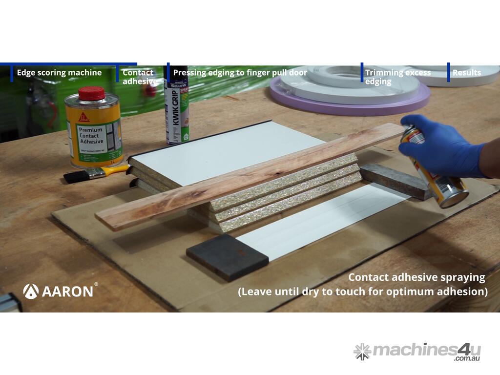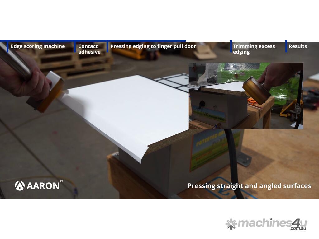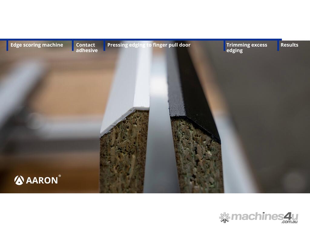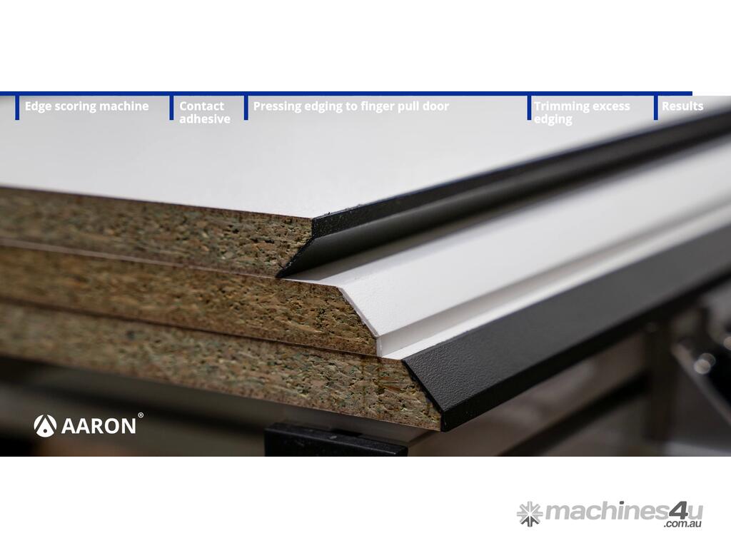 With our new patent-pending Aaron Edge Scoring Machine in conjunction with the existing Vacuum Table and revised Edge Trimming Machine, we've designed an effective and productive process for creating finger-pull, handle-free, no-ware doors and drawers.