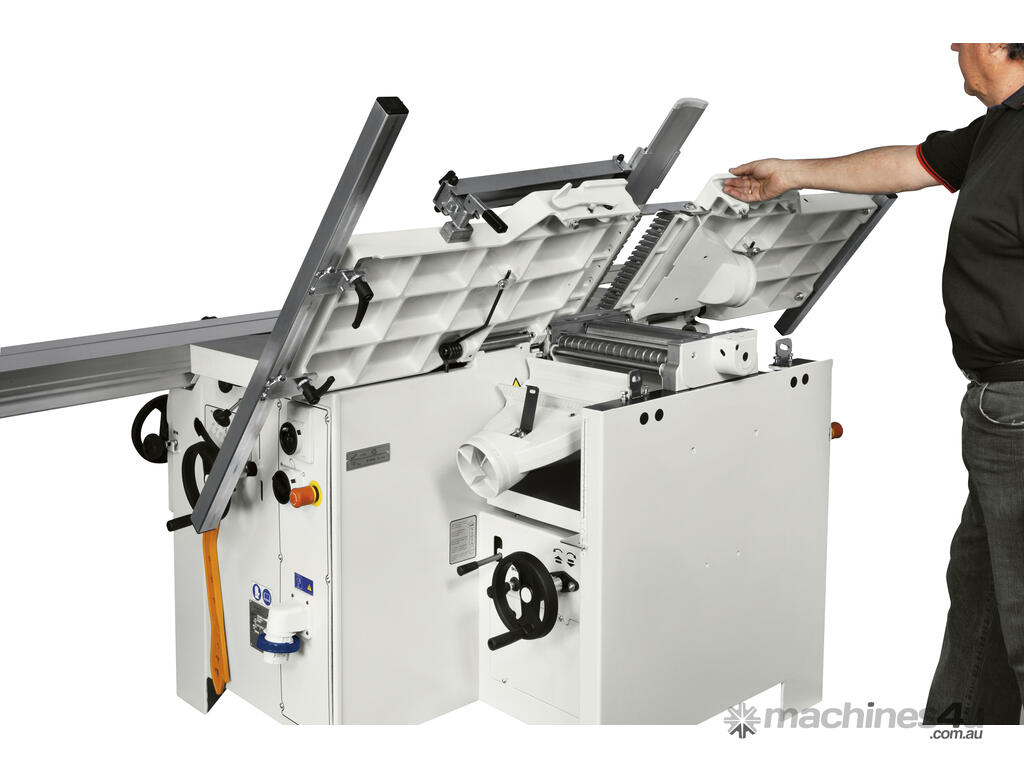 •	More comfortable thicknessing: during the changeover from surfacing to thicknessing the surfacing tables open towards the inside of the machine, with a 90° angle and simultaneously.