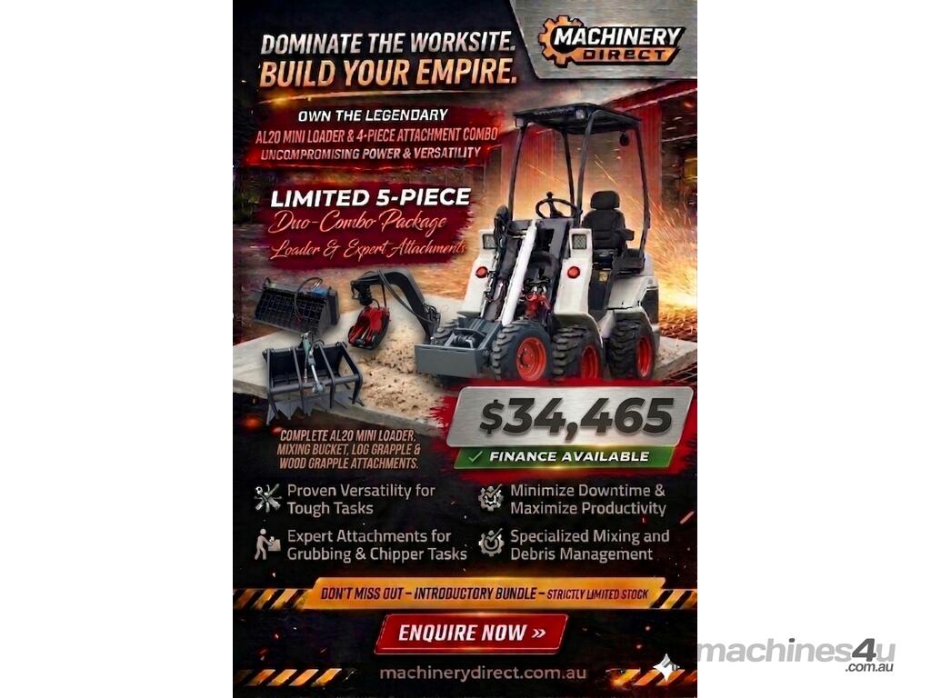 New Ozziquip AL20 Mini Loader 4-in-1 with Mixing Bucket, Log Grapple & Wood Grapple 5-Piece Package :      $31,332 AUD($34,465 Inc. GST)