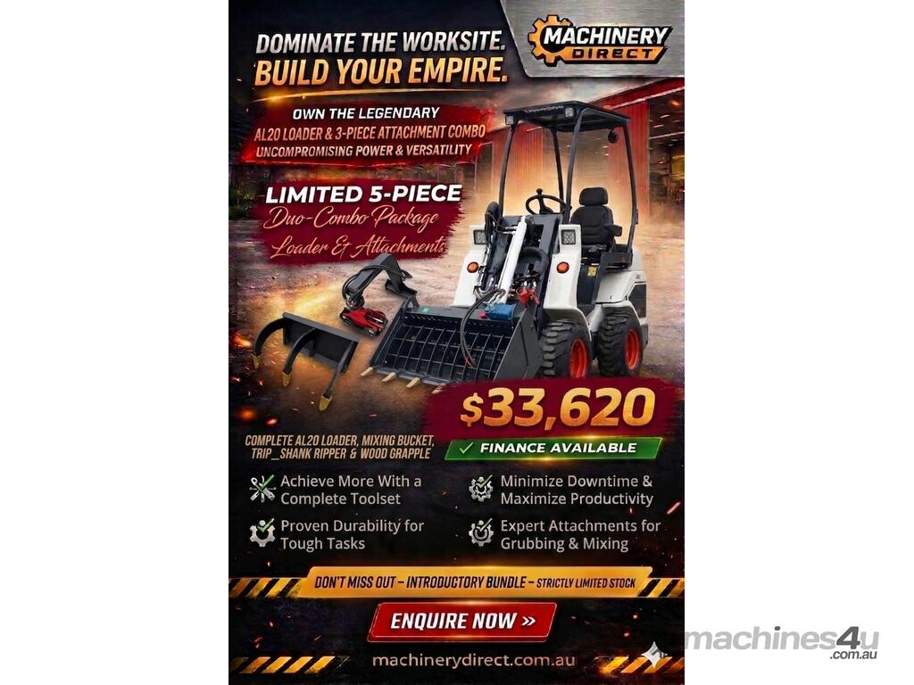 New Ozziquip AL20 Mini Loader 4-in-1 with Mixing Bucket, Ripper and Wood Grapple 5-Piece Package :      $30,564 AUD($33,620 Inc. GST)