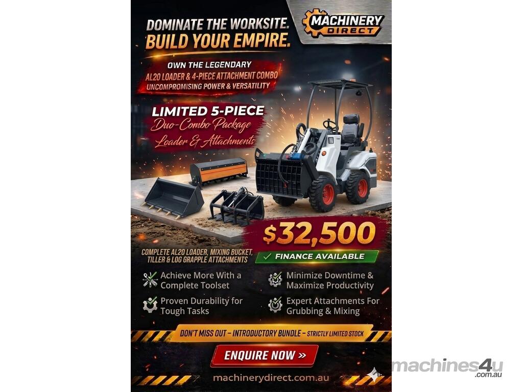 New Ozziquip AL20 Mini Loader 4-in-1 with Mixing Bucket, Tiller and Log Grapple 5-Piece Package :      $29,545 AUD($32,500 Inc. GST)
