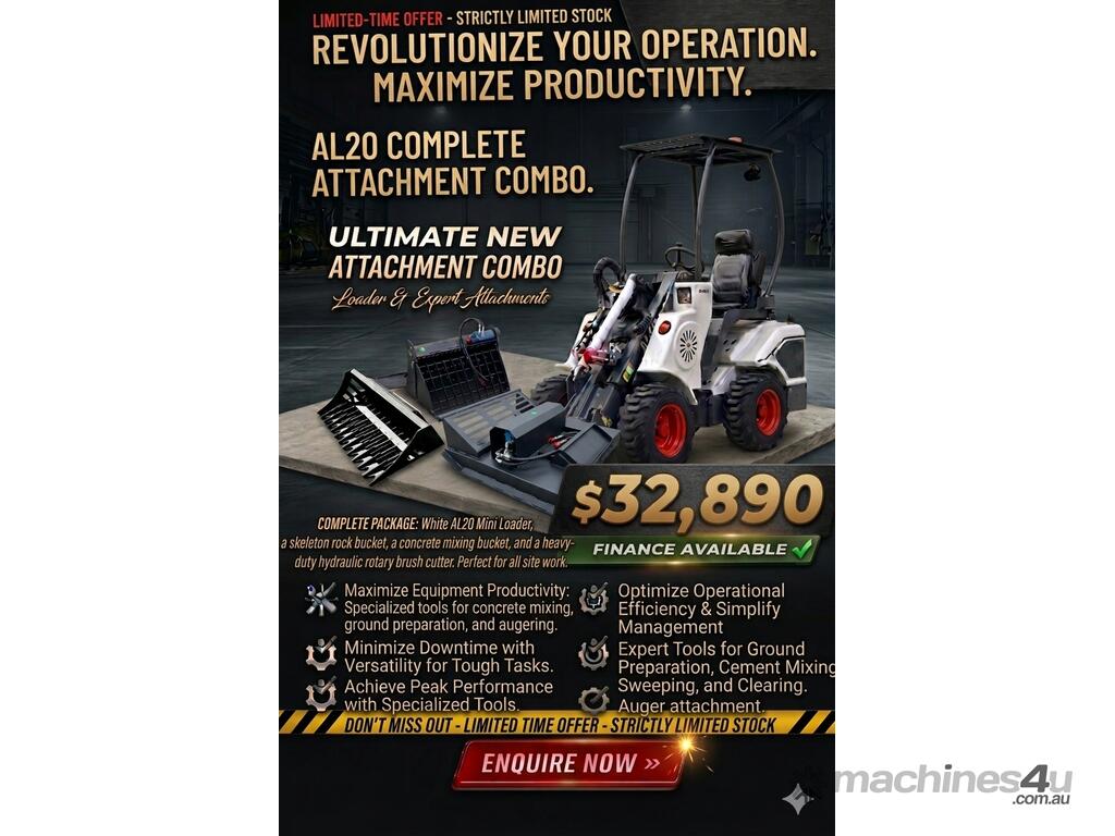 New Ozziquip AL20 Mini Loader 4-in-1 with Stone Bucket, Mixing Bucket, Brush Cutter 5-Piece Package :      $29,900 AUD($32,890 Inc. GST)