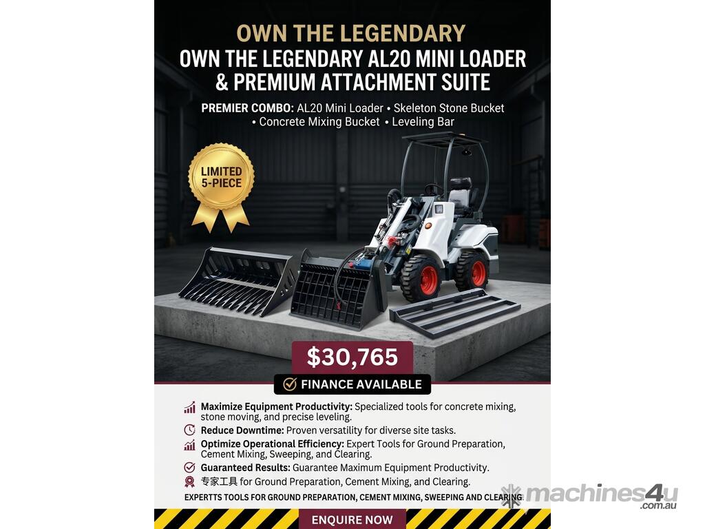 New Ozziquip AL20 Mini Loader 4-in-1 with Stone Bucket, Mixing Bucket, Leveling Bar 5-Piece Package :      $27,968 AUD($30,765 Inc. GST)