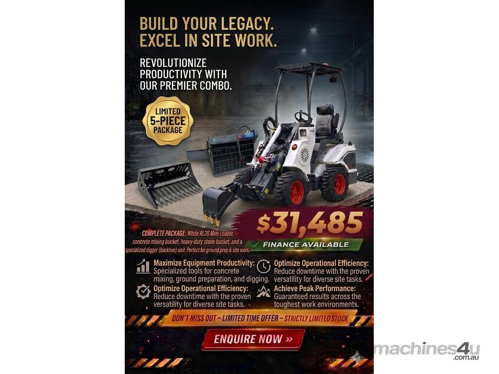 New Ozziquip AL20 Mini Loader 4-in-1 with Stone Bucket, Mixing Bucket and Digger 5-Piece Package :      $28,623 AUD($31,485 Inc. GST)