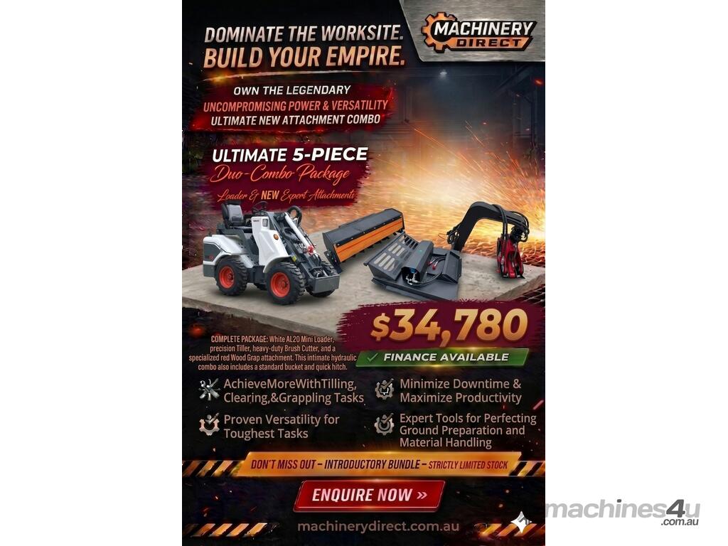 New Ozziquip AL20 Mini Loader 4-in-1 with Tiller, Brush Cutter and Wood Grapple 5-Piece Package :      $31,618 AUD($34,780 Inc. GST)
