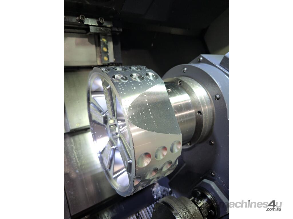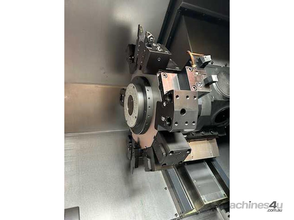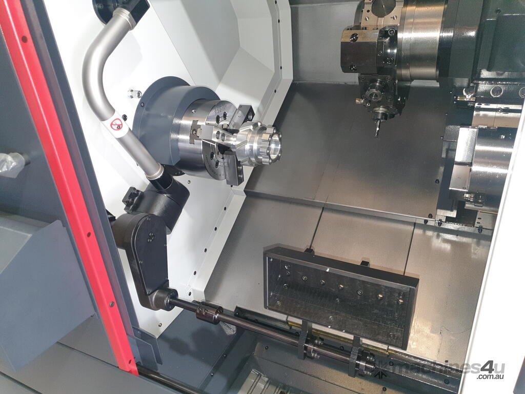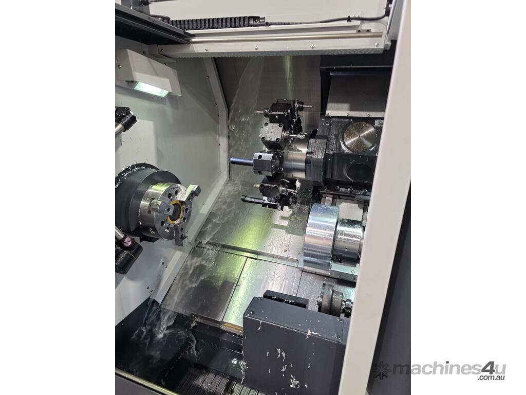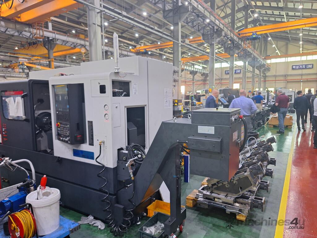 Korean Made CNC Slant Bed Dual Spindle Lathe with Linear Rails including Y axis and C axis Live Tool capabilities, fanuc control system, designed for automation, rigidity, speed and performance.