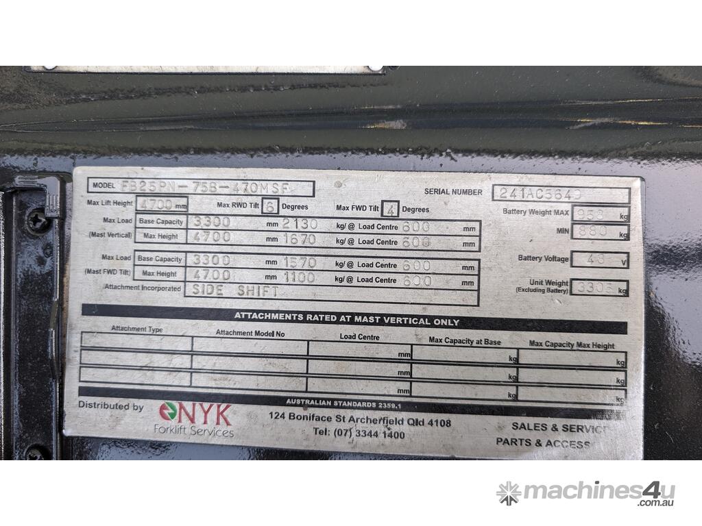 The Nichiyu FB25 is a powerhouse electric forklift with a 2500 kg capacity, perfect for handling heavy loads with ease. With its impressive 4.7m triplex mast and side shift feature, this forklift offers maximum maneuverability and efficiency in any warehouse setting. Trust in the Nichiyu FB25 to elevate your operations to new heights.